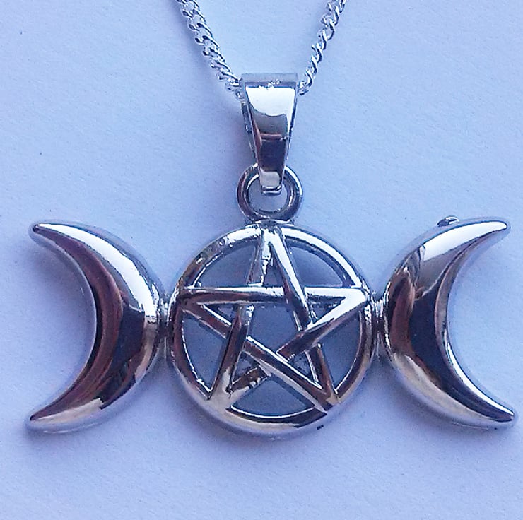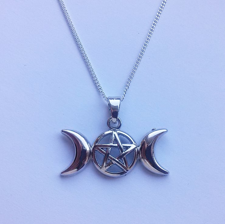 This enchanting necklace features a triple moon pentagram pendant. This hangs on fine silver plate chain. The necklace is 18" and it is lobster fastening.
