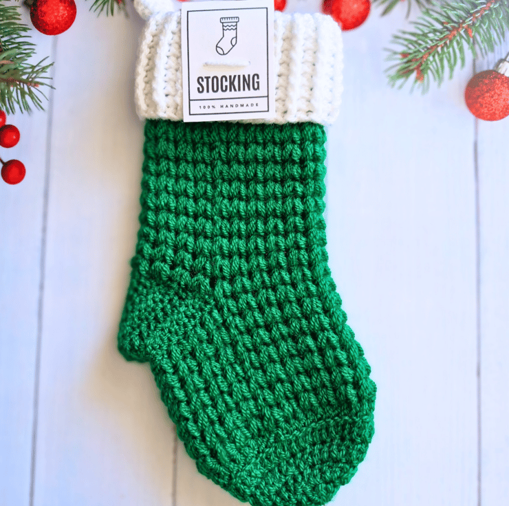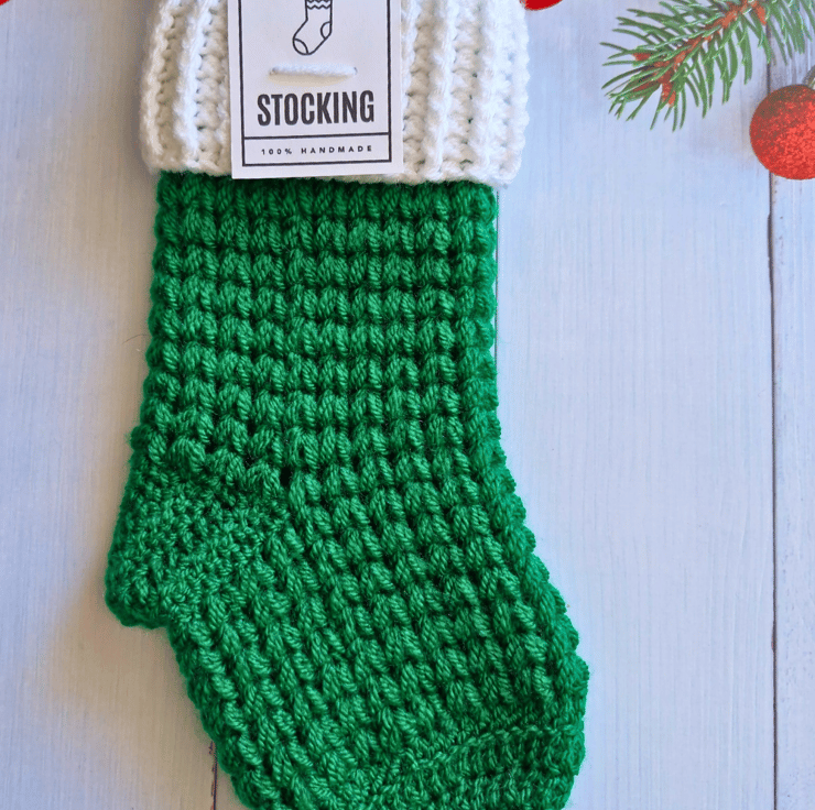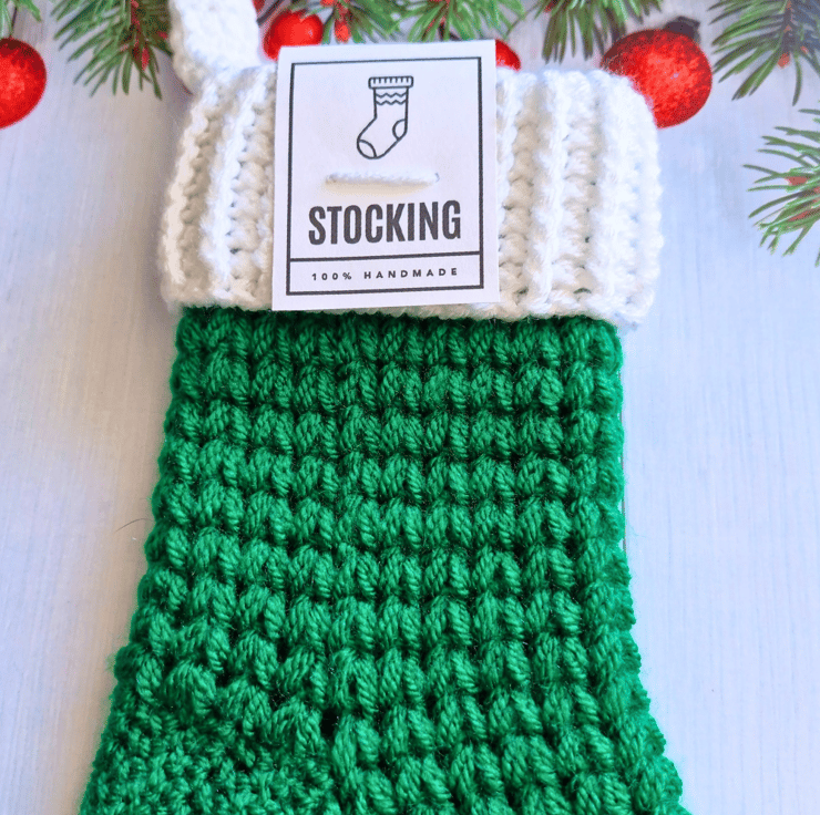 Crocheted in a textured stitch, it features a white ribbed cuff, and a built-in hanging loop so it's ready to display wherever you choose.