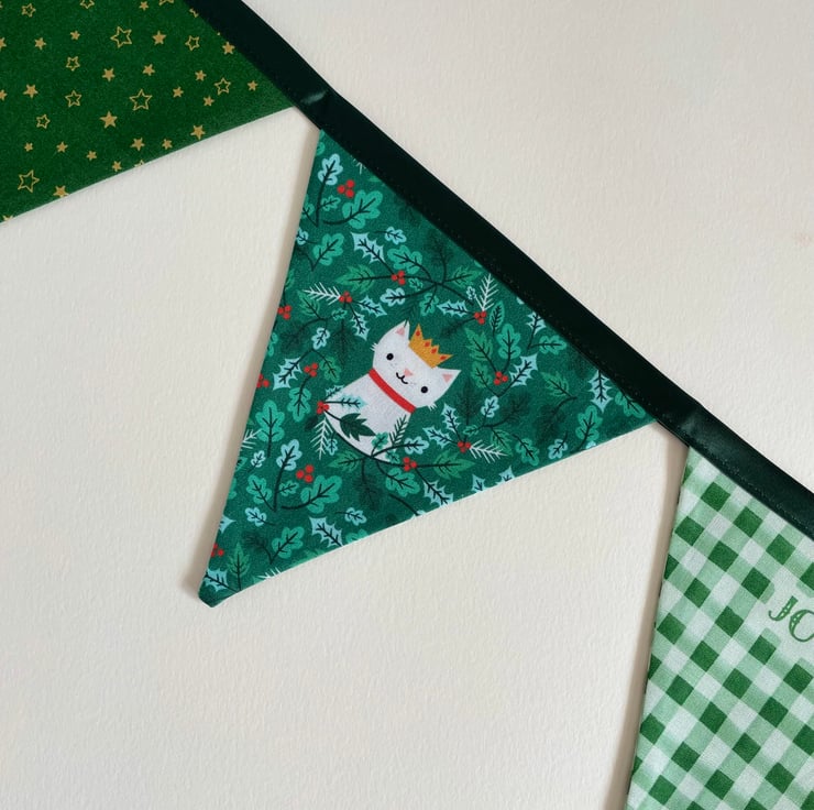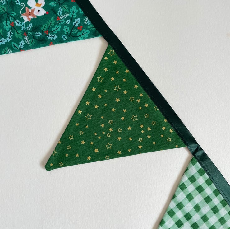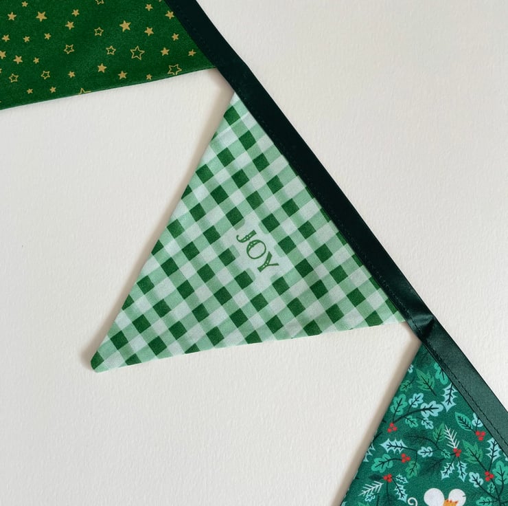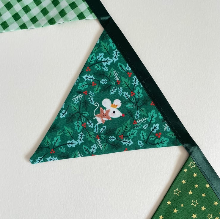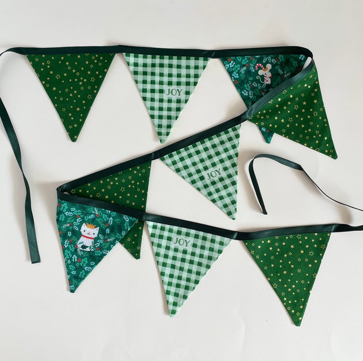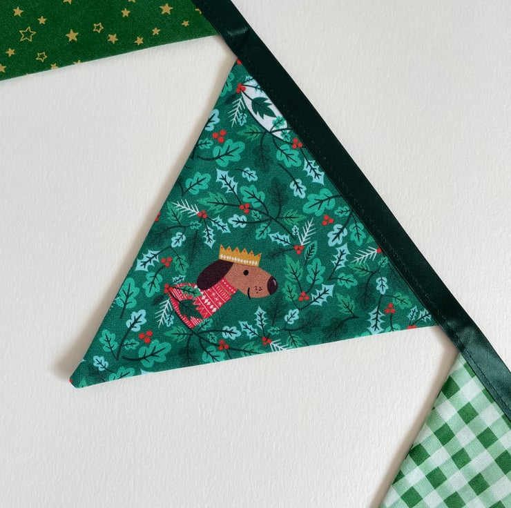 Cute bunting with little animals celebrating Christmas. 9 double sided panels. The flags are approx 14 cm wide at the top and 14 cm long. The bunting is 209 cm long from one end to another.
