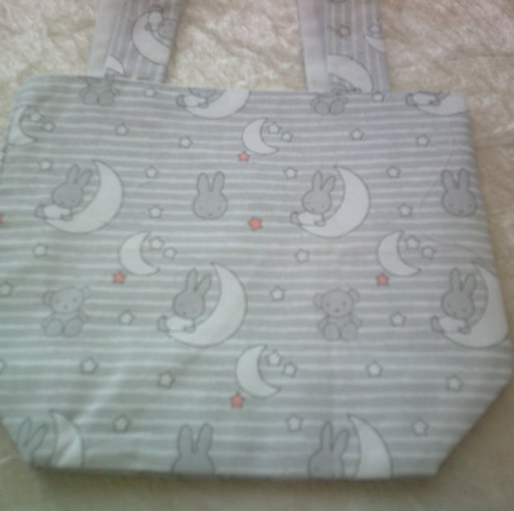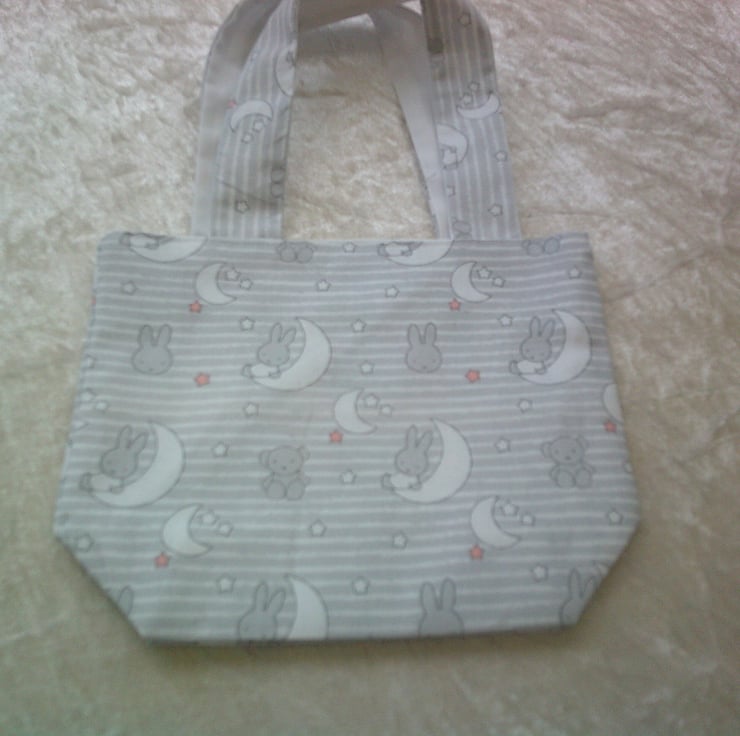 This Childs Handbag Fabric bag is made using a 100% Cotton Fabric featuring Miffy Rabbit sitting on Crescent moons on a pale grey background.