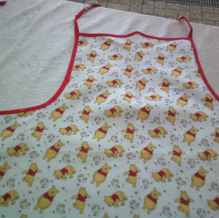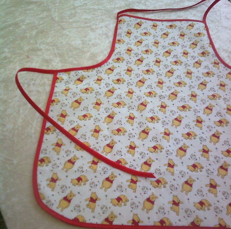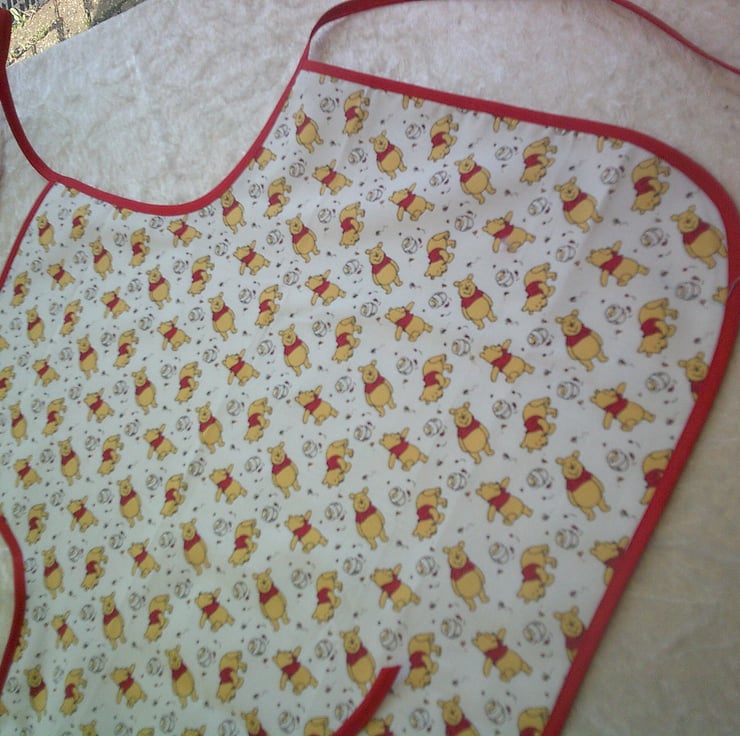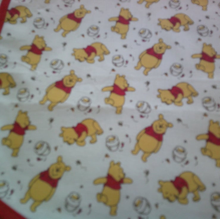 The fabric used has a design of Winnie the Pooh on a white background and is edged with a contrasting red bias binding.