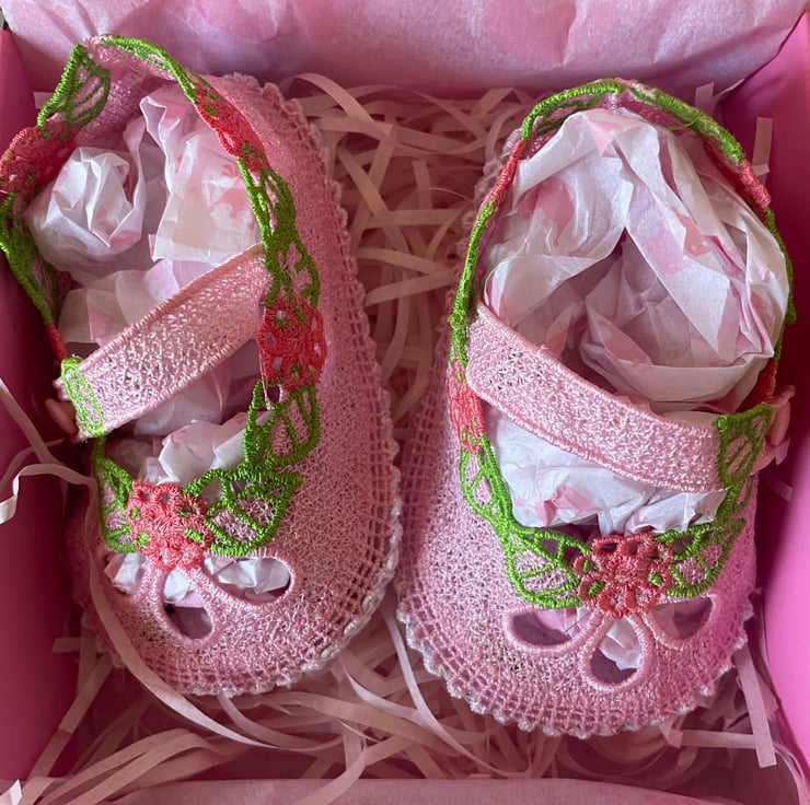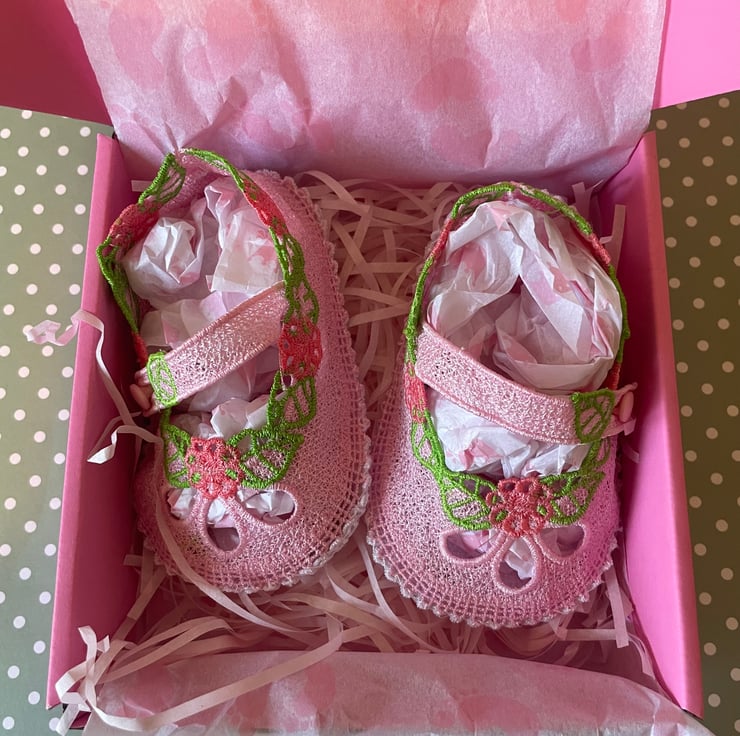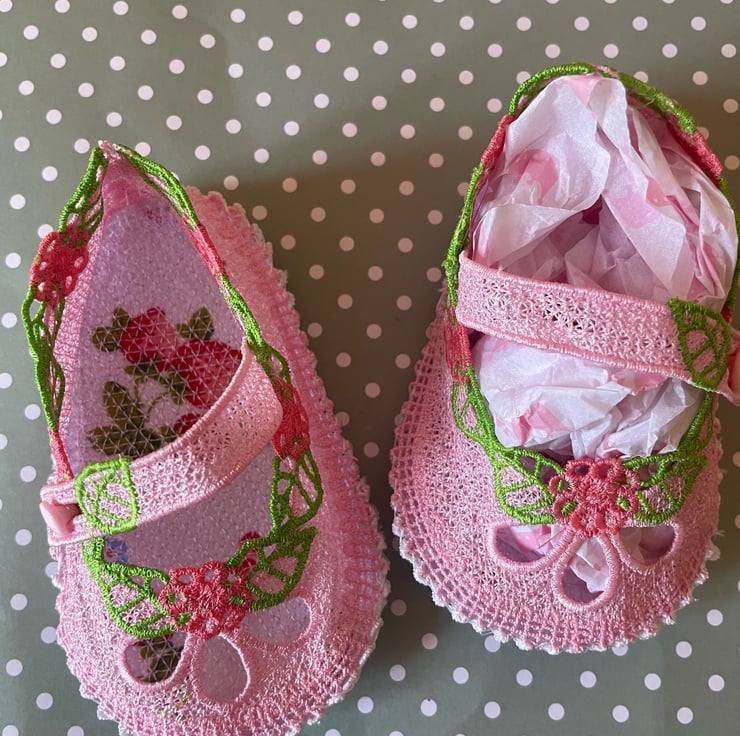 These beautiful baby shoes are lovingly handcrafted using free-standing lace, stitched piece by piece on an embroidery sewing machine and then hand-sewn together with care. Made from 100% cotton and fully lined, these shoes are soft, breathable, and ideal for delicate little feet.