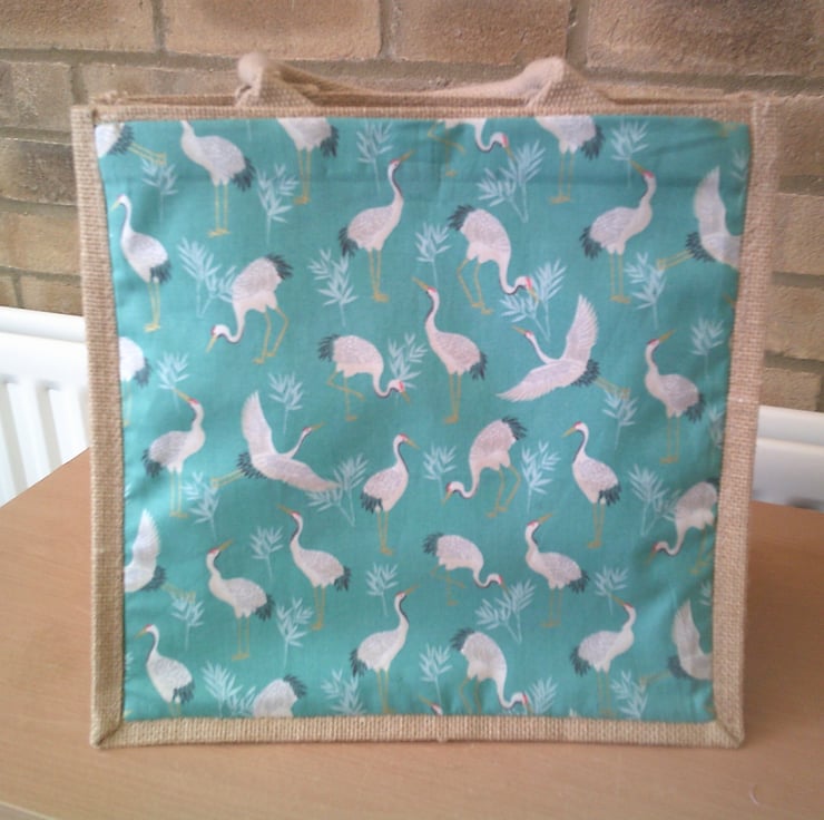 The bag itself measures approximately 30 x 30 x 20 cm (12 x 12 x 8 inches). The fabric pocket - which has been hand sewn onto the bag is a design of Japanese style cranes on an aqua coloured background.