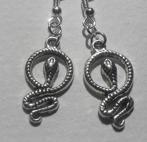 These pretty earrings feature beautiful snake charms hanging from silver plate hooks.