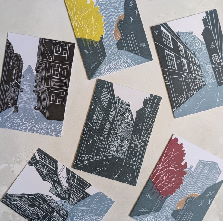 Little Shambles limited edition linocut print, as viewed from the Shambles Market looking towards the Monkbar Chocolatiers.