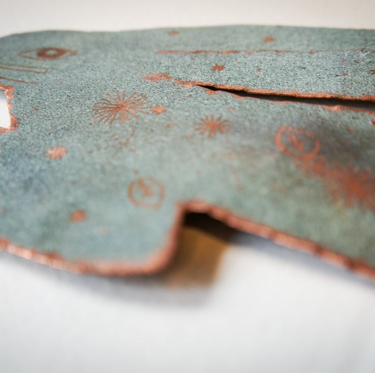 There is a naturally occurring blue turquoise patina on the firey toned copper.
