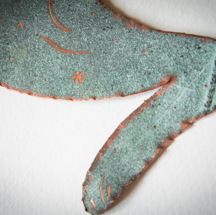 A leaping hand cut copper hare with delicate hand engraved rose leaf and star detail.