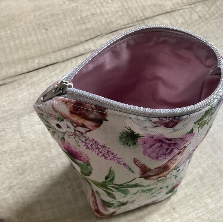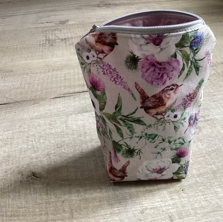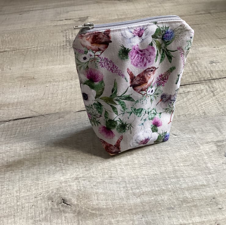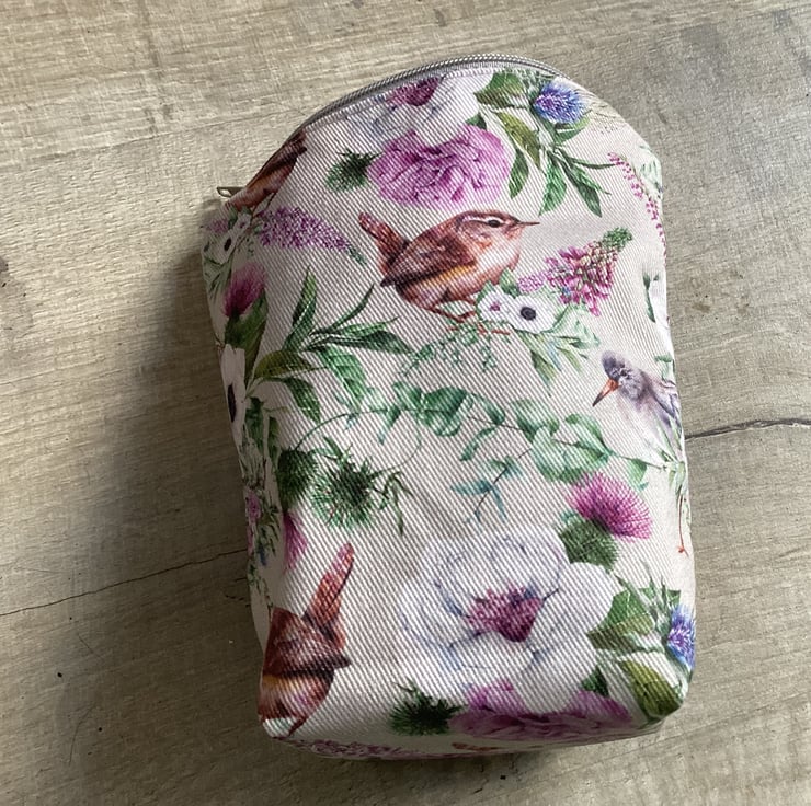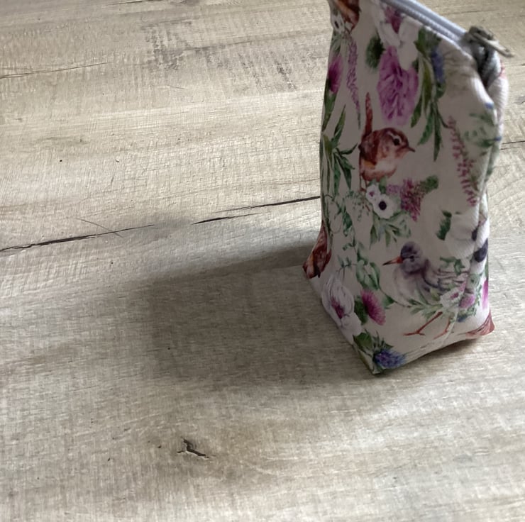 This stunning pouch handmade by me in my home studio in West Midlands. Ive made this unique pouch from stunning and colourful Cotton Drill Birds and Flowers fabric and cotton for lining. Wadding inside. Approx measurement W top 13.5 cm, D 6 cm, H 15 cm. Pouch with a wide range of use, perfect for makeup, jewellery or ideal for that stunning look on your dressing table. Perfect gift for any occasions. Please note: Colours may slightly vary due to the lighting during the photo shooting or the monitor's display.