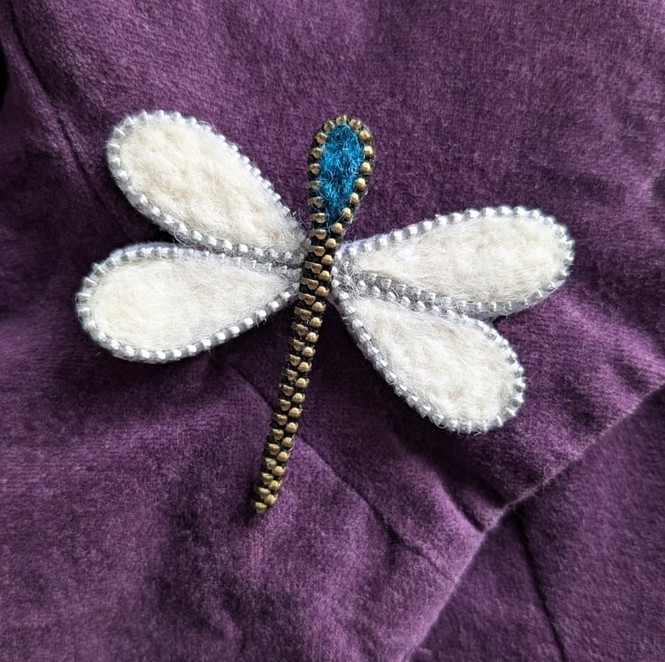 Hand felted wool Dragonfly brooch and finished with signature silver and brass metal zip edging.