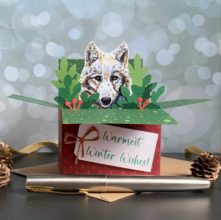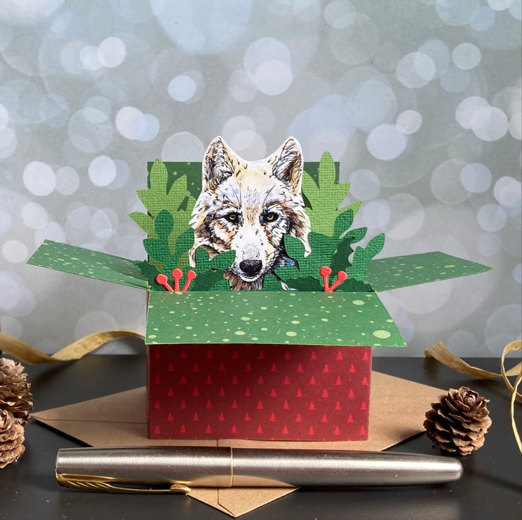 Wolf Christmas Card. 3D wolf box card. Personalised Christmas gift card holder. Designed and handmade entirely by me, including my white wolf illustration and foliage cut from green card. A great way to present a Christmas gift card to a wolf lover.