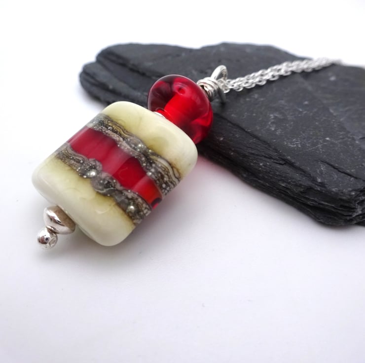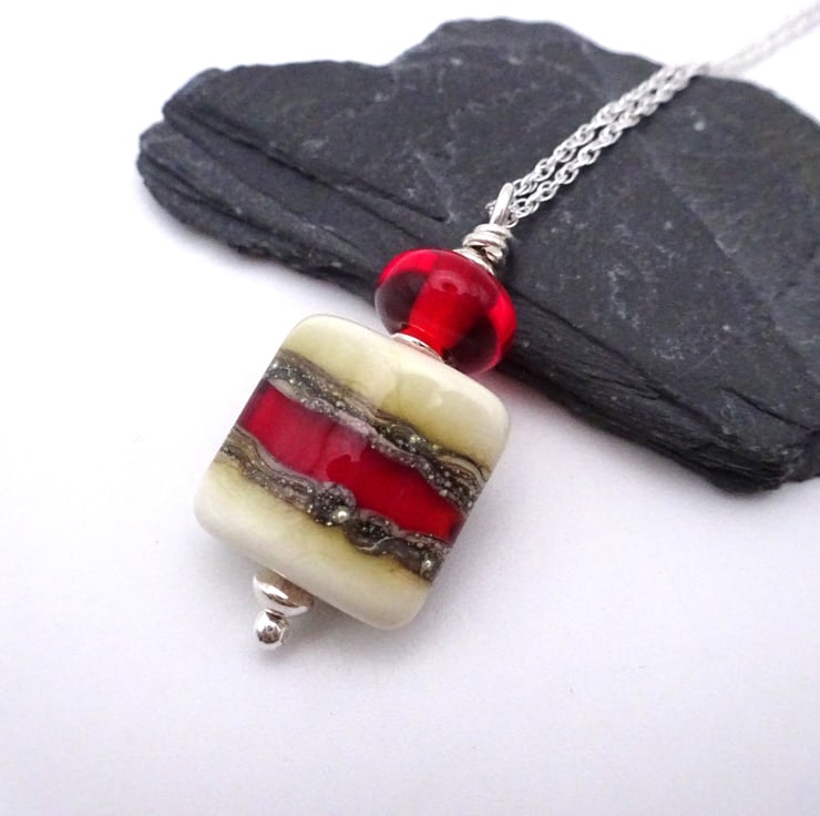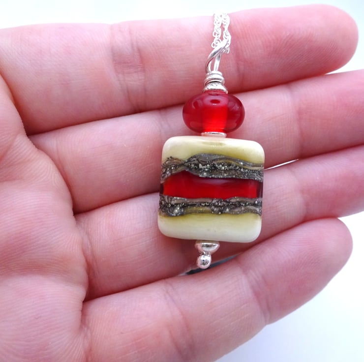 The lampwork glass pendant has been handmade by me using red and ivory glass, it has been shaped using a brass press.