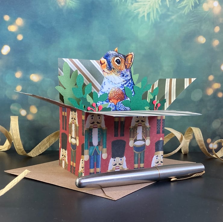 Squirrel Christmas Card. 3D squirrel box card. Personalised Christmas gift card holder. Designed and handmade entirely by me, including my squirrel illustration and foliage cut from green card. A great way to present a Christmas gift card to an animal lover.