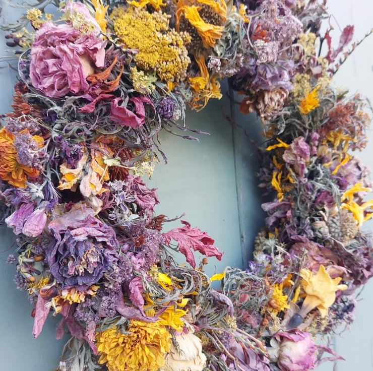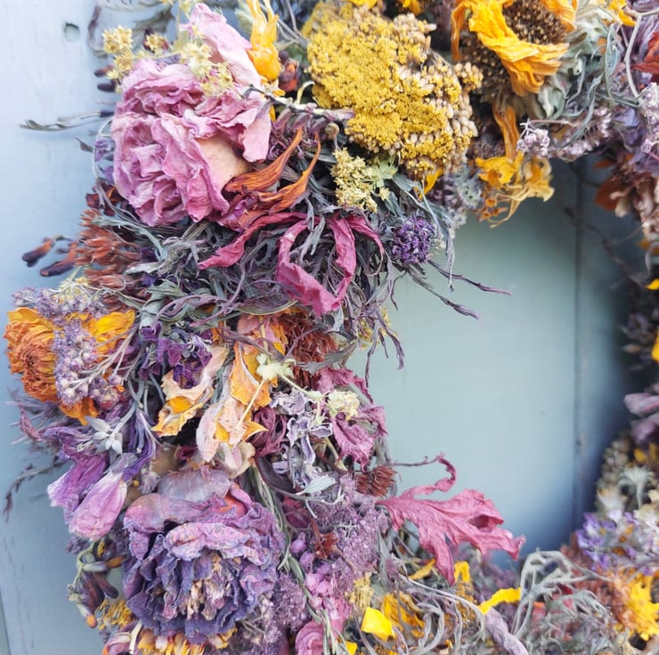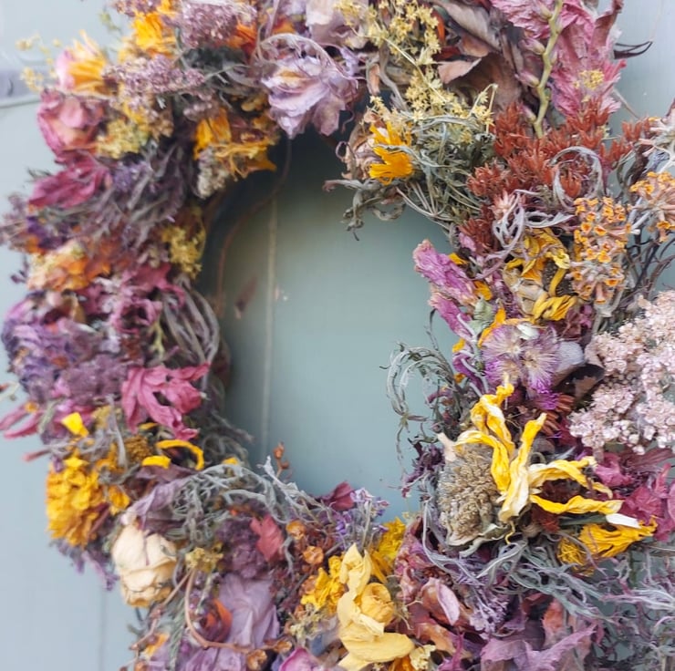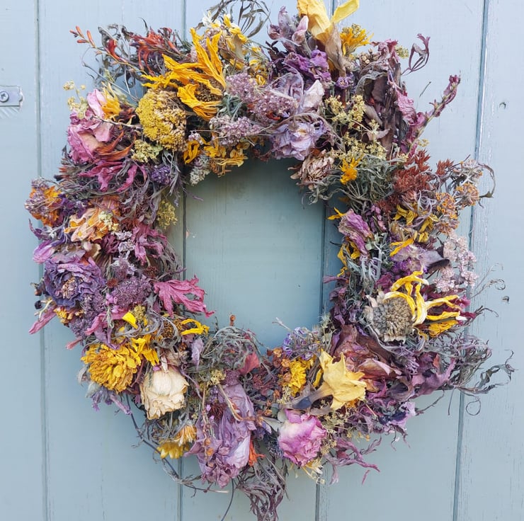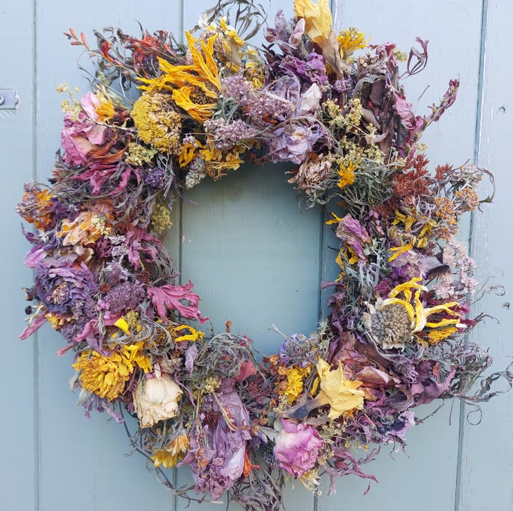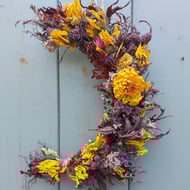 A handmade dried flower wreath measuring approximately 28cm in diameter.