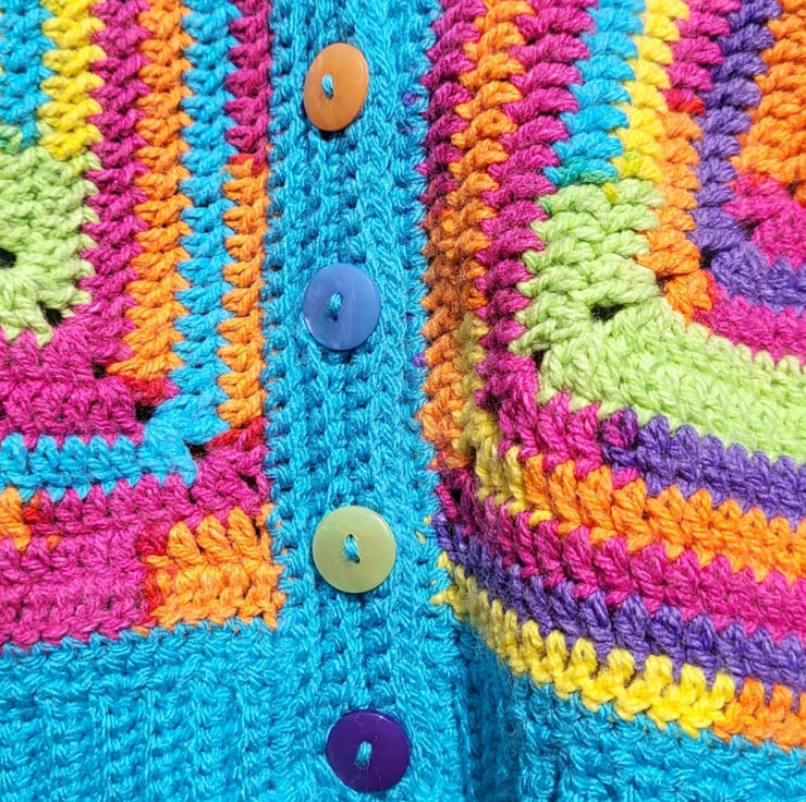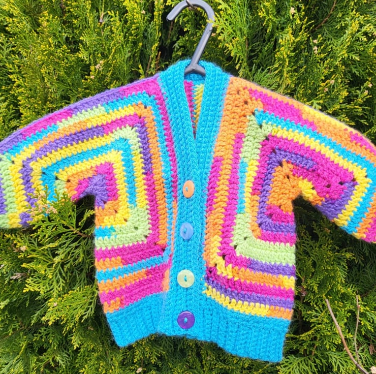 Colourful baby cardigan, hand crochet using premium acrylic yarn and embellished with colourful coardinated buttons.