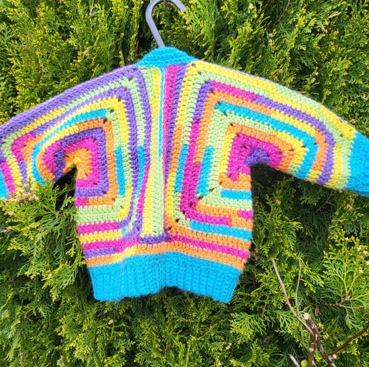 I made one of these cardigans for my gorgeous grandson, and he loved it so much I have made him one in the next size up too. I love this bright colourful yarn, and have made more including smaller sizes to sell in my shop.