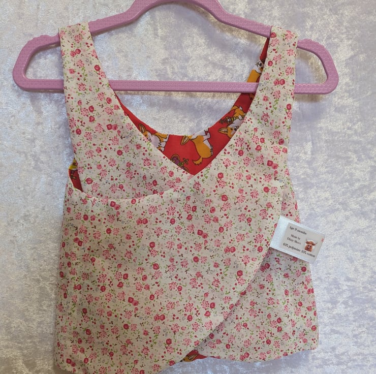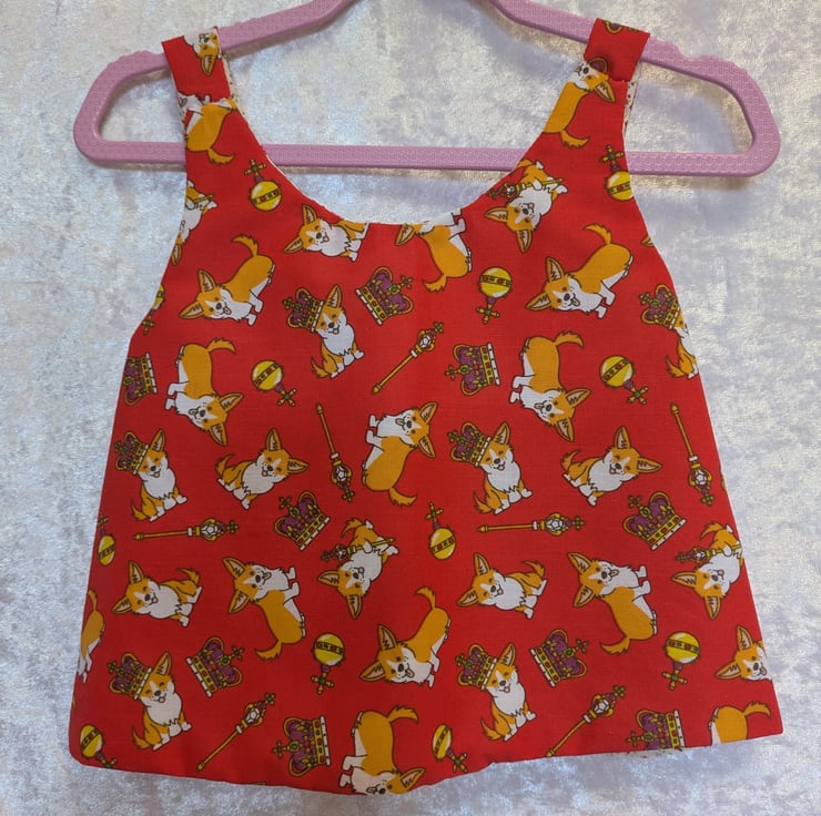 A regal baby top, that is reversible, it has cute little corgis with crowns and the orb and sceptre on a red background. The reversed side has red and pink dainty flowers. Perfect for a little summer top or worn over a t-shirt in winter. Suitable for ages 6-9 months.