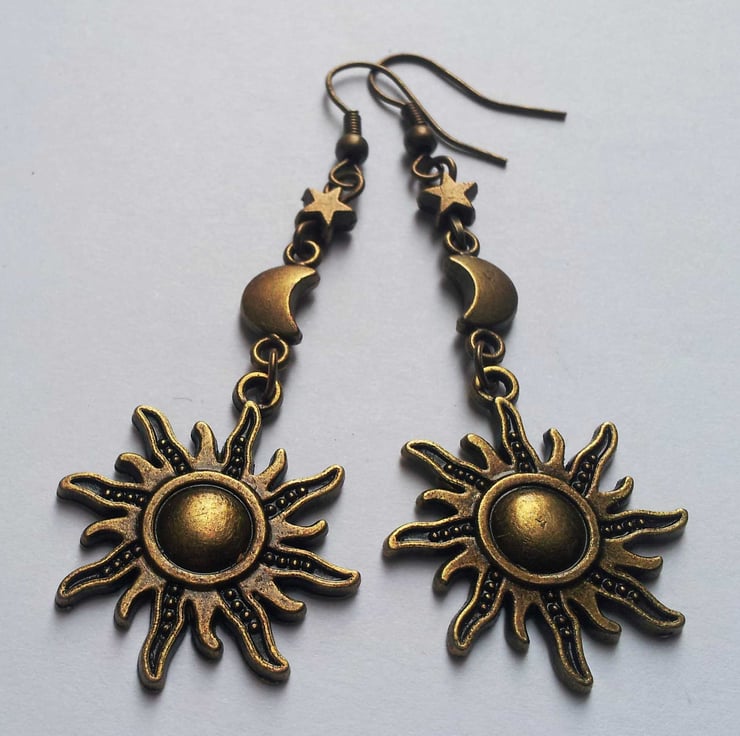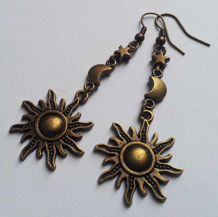 Long dangling celestial earrings with stars, moons and suns hanging from bronze hooks.