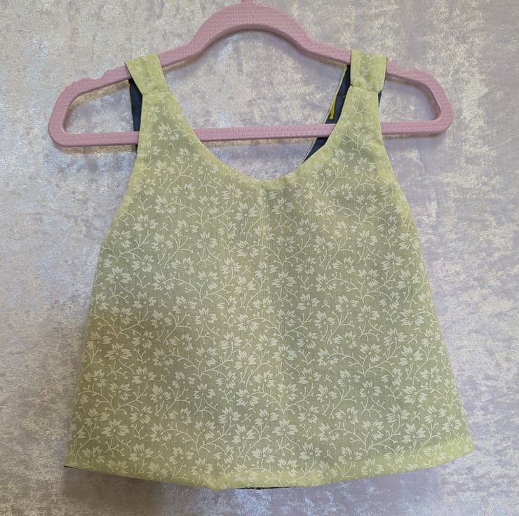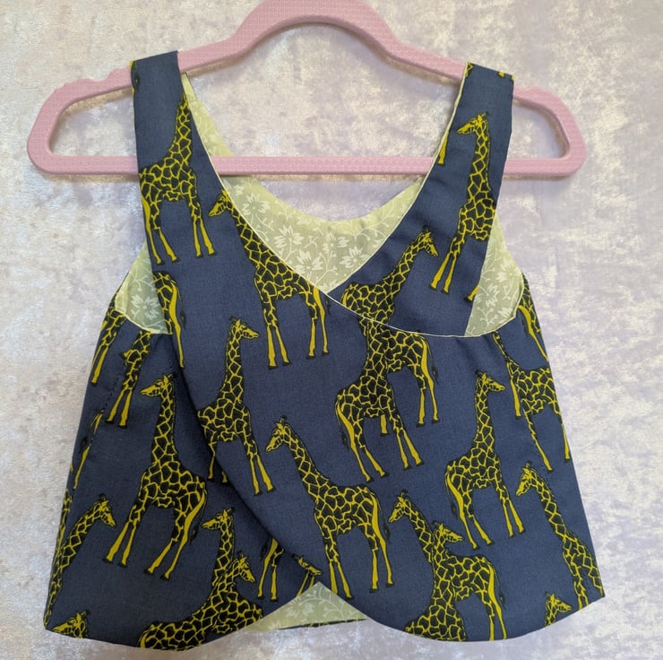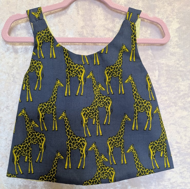 A cute reversible baby top, pinafore style that crosses over at the back. Blue background with striking giraffes. The other side is Yellow with white flowers. Great for a summer top or over a t-shirt in winter, for an extra warm layer. Suitable for 6-9 months.