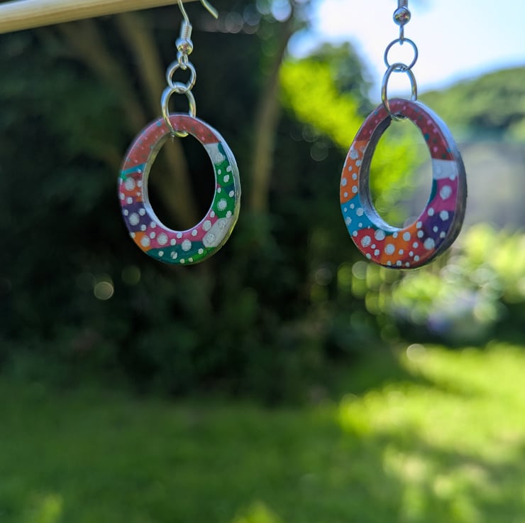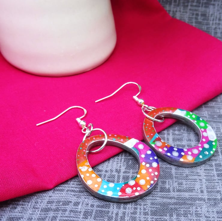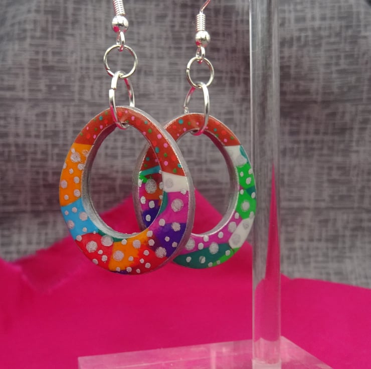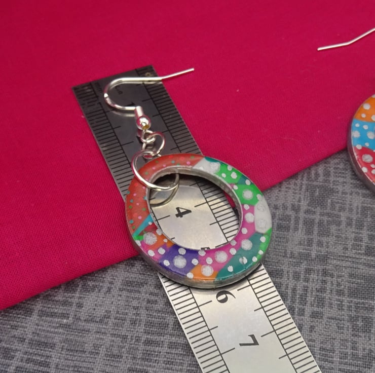 These earrings are placed on a stainless steel hook, and including this hook measure at approximately 6 cms. The photographs have been taken in different light settings, and show the colour in these settings. They are brightly coloured, however the silver paint tones the brightness down. The earrings are varnished in a fimo gloss which gives them a glossy glassy appearance.