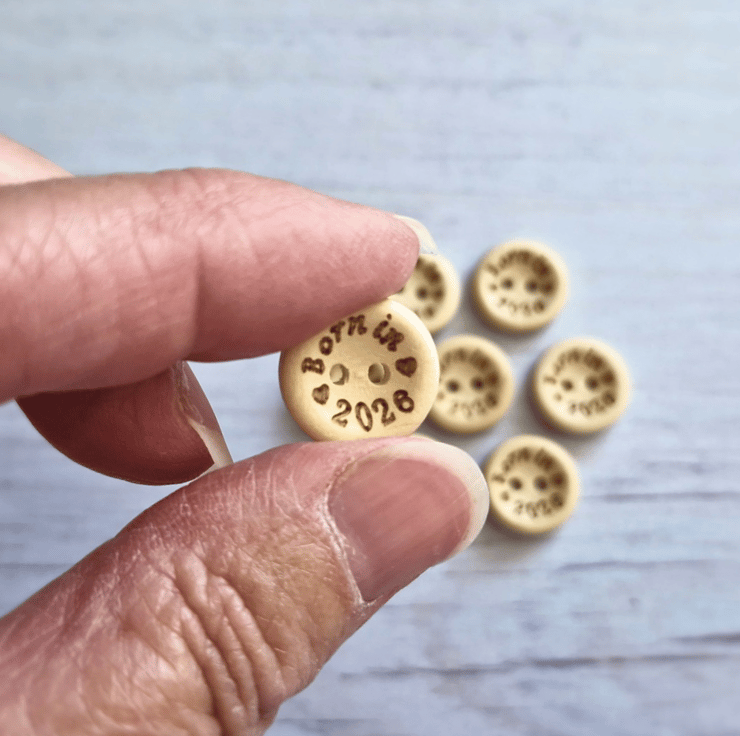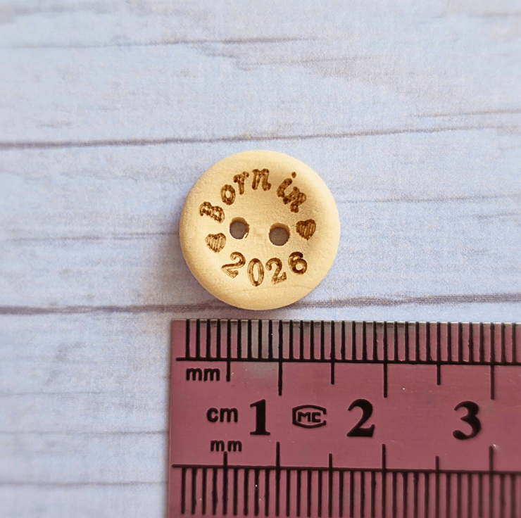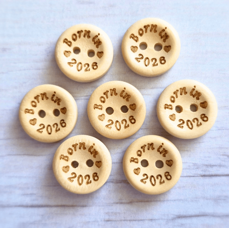 Add a finishing touch to your handmade baby items with these natural wooden buttons, printed with Born in 2026. Measuring 15mm across, they’re the perfect size for booties, cardigans, keepsake toys, or memory blankets especially for newborns arriving in the year 2026.