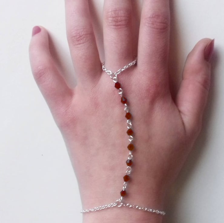 Red Crystal Bead Hand Chain Silver Plate Bracelet
