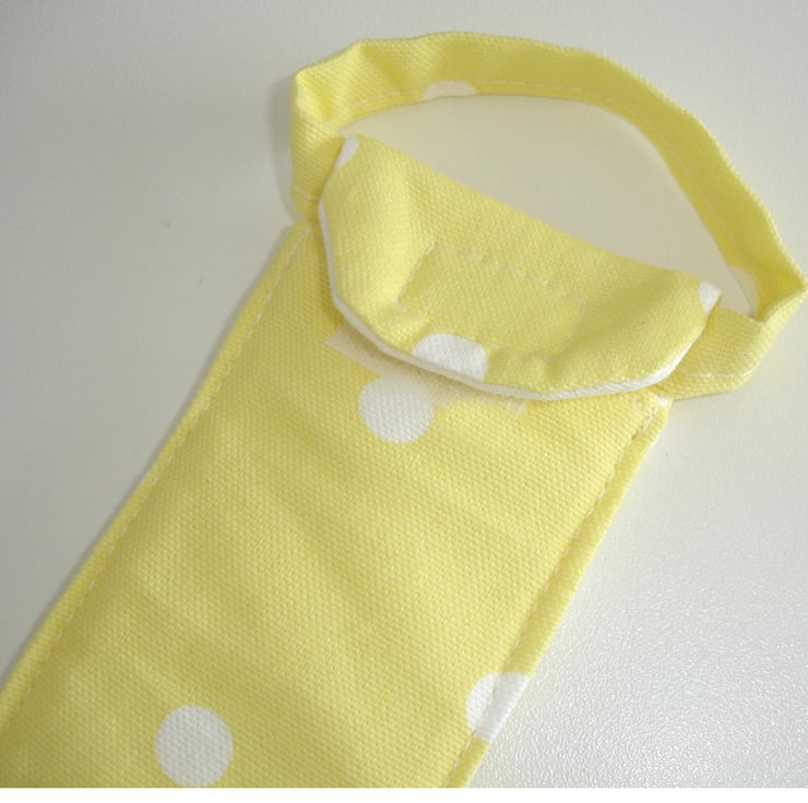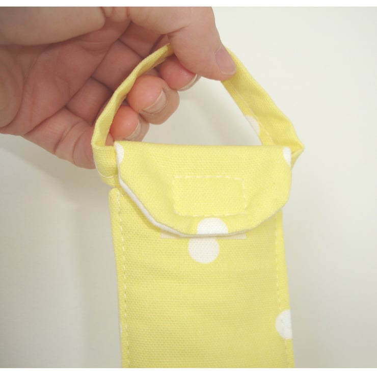 Closes with a Velcro Fastening and has a handle at the top.