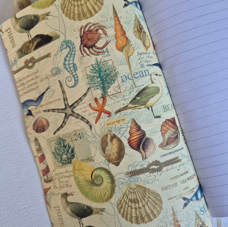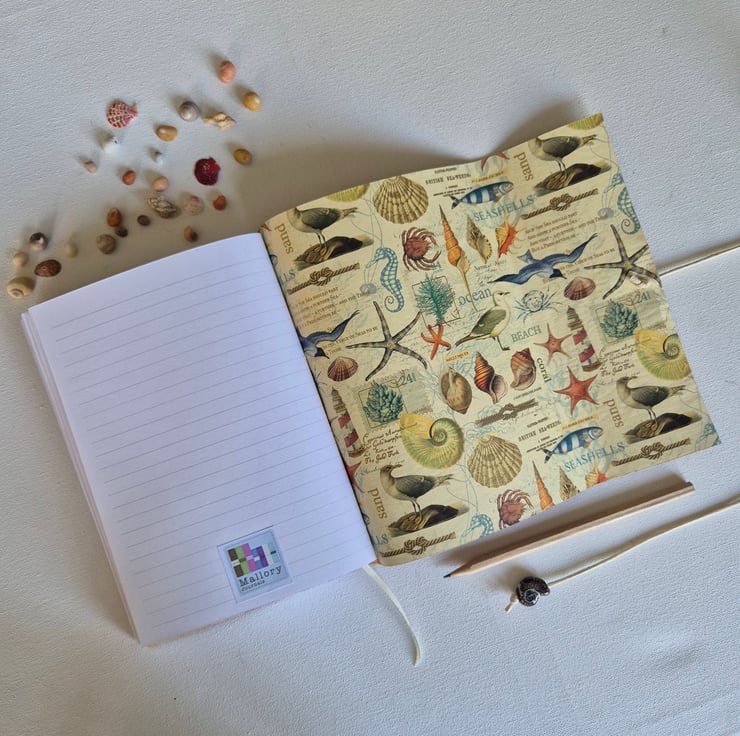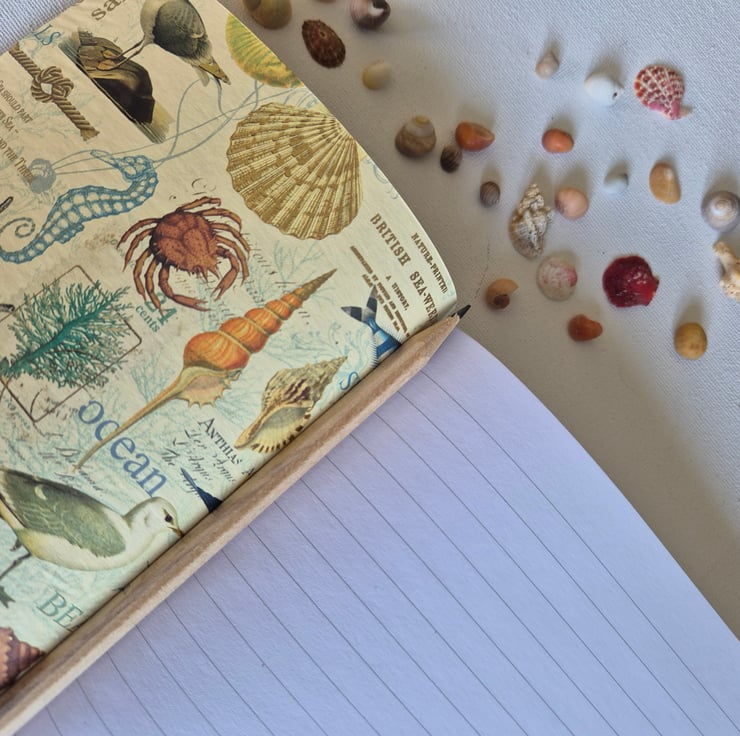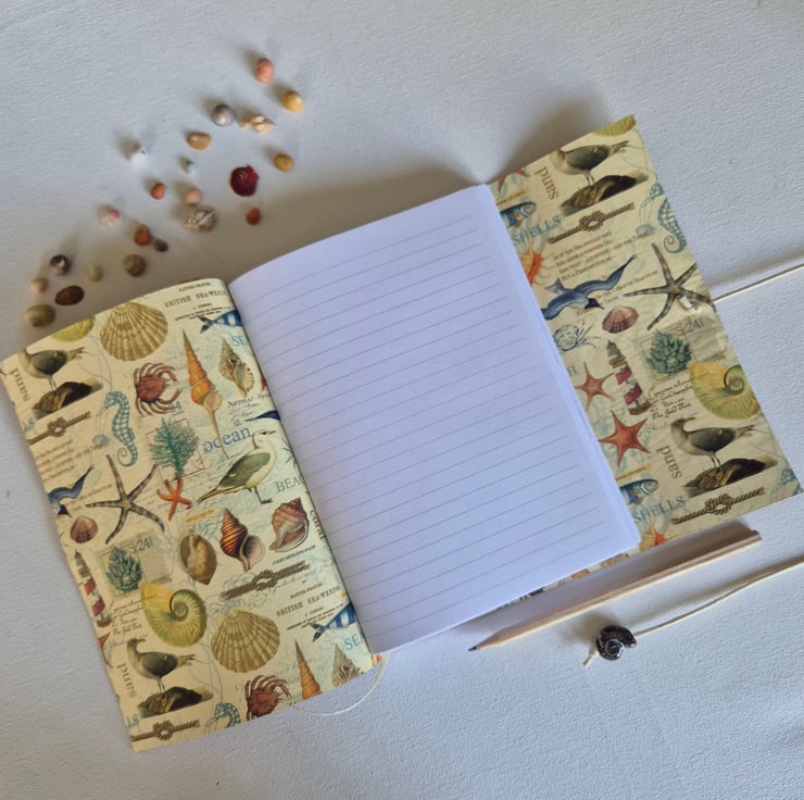Seaside or Seashore Journal, beautifully illustrated with seashells, seahorse, seagulls, fish, crabs, starfish and light house. It would make a perfect Nature Journal, Daily Journal or Sketchbook.