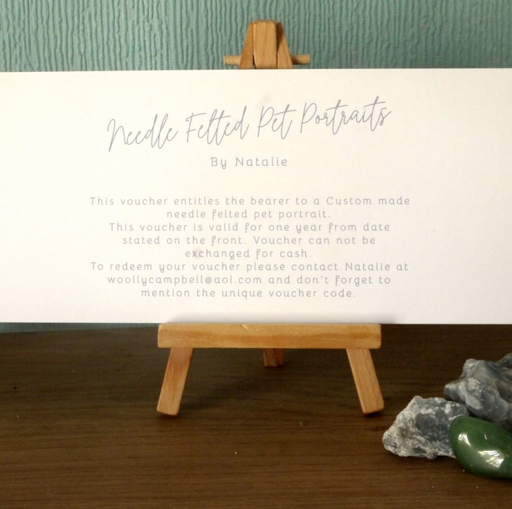 Looking for the perfect gift for a pet owner? We now offer gift vouchers for our custom needle felted pet portraits. You can still choose from a single for £65 or double portrait for £105 -autumn special price - just view variations , then We will send the gift voucher to you. Our vouchers will be sent to you with a unique code written on for the giftee to include in their email to us along with the purchase date from which they have 1 year to use their voucher. Also included is a pretty pearl envelope for you to gift it in. All the giftee then has to do once they receive their voucher is send us an email with the code on and then we can start planning the portrait, all of which is explained on the back of the voucher.