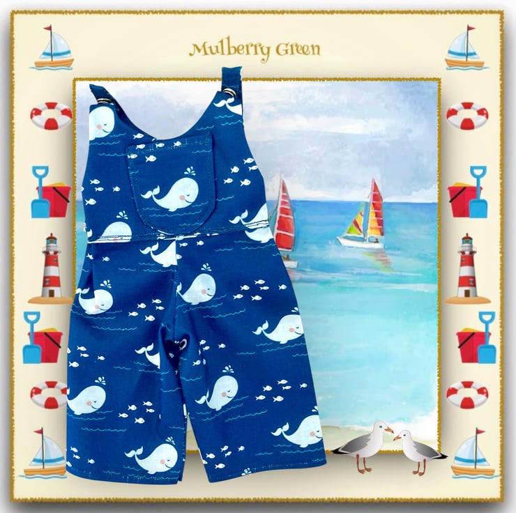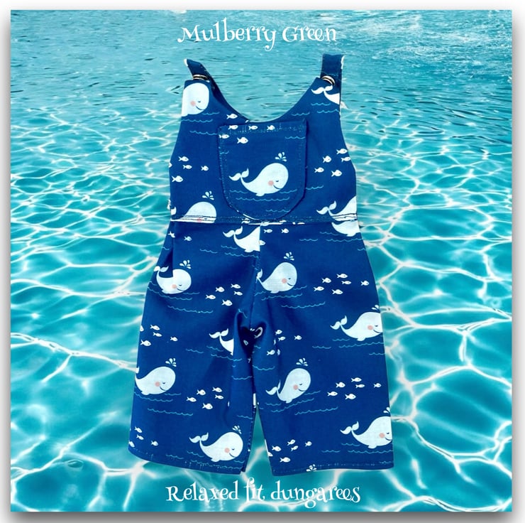 A pair of relaxed fit cotton dungarees, in really cute whale print, made to fit the Mulberry Green characters. They are made from best quality cotton, have a front pocket and fasten with two little poppers. The sides are adjustable.