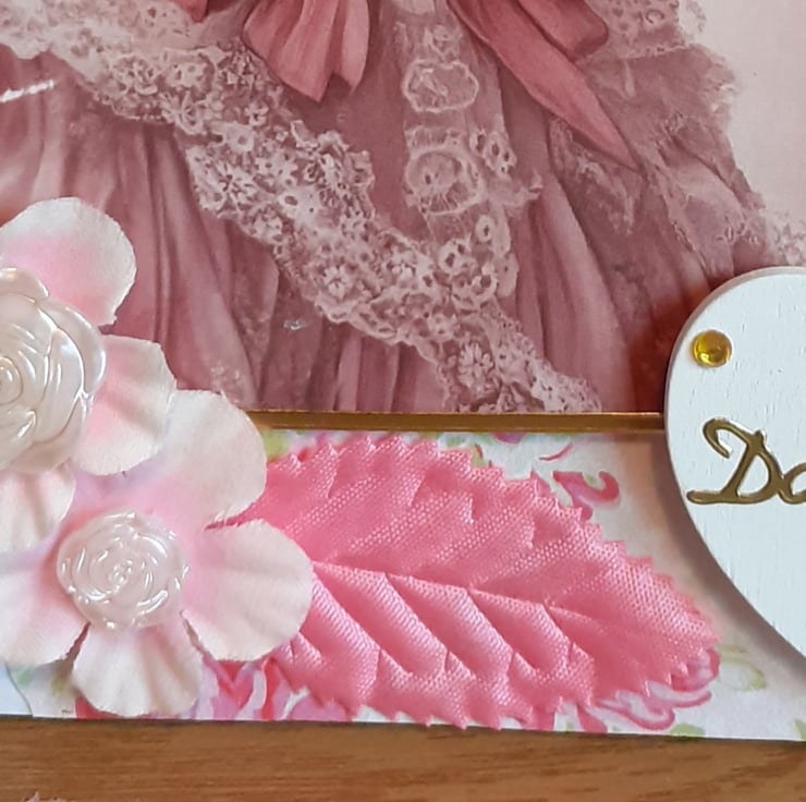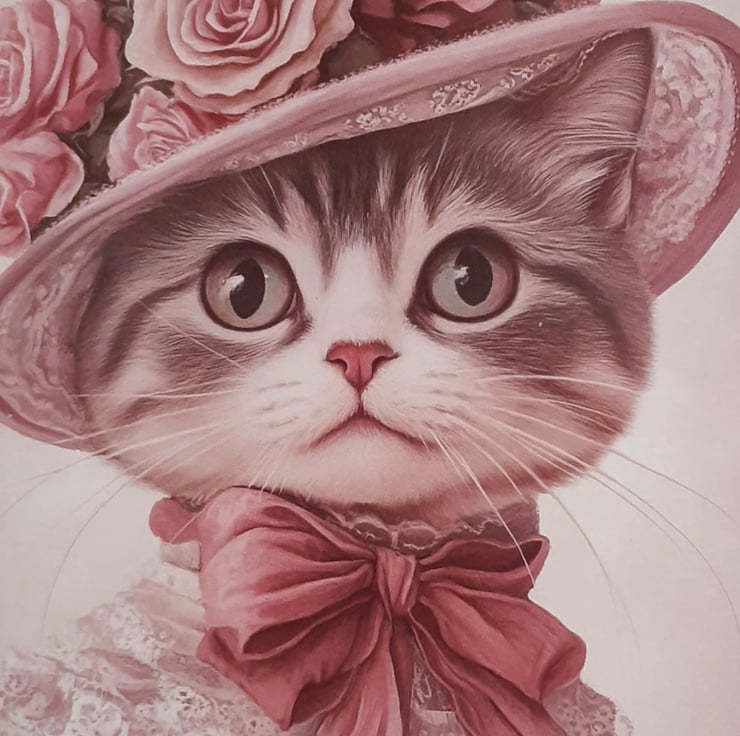 A stunning 5x7inch Birthday card, a backing paper of shimmer Rose's with an image of a sweet grey tabby cat wearing a velvet dress & bonnet in dusky rose. Flowers are around the bonnet.