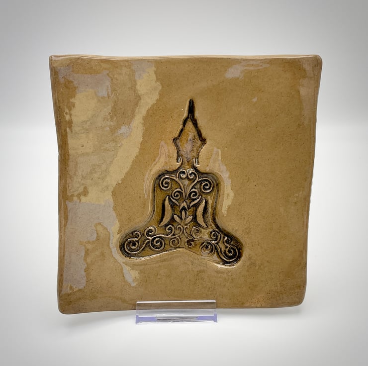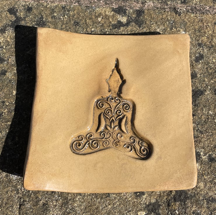 This handcrafted ceramic platter has been created using the slab-work method and embossed with a Buddha design before it is shaped into a mould. Once dried it has been bisque fired to 1000C, after a gentle sanding it has been hand-painted with an oxide stain with a clear glaze added. After glazing it has had a second firing in the kiln to 1250c.