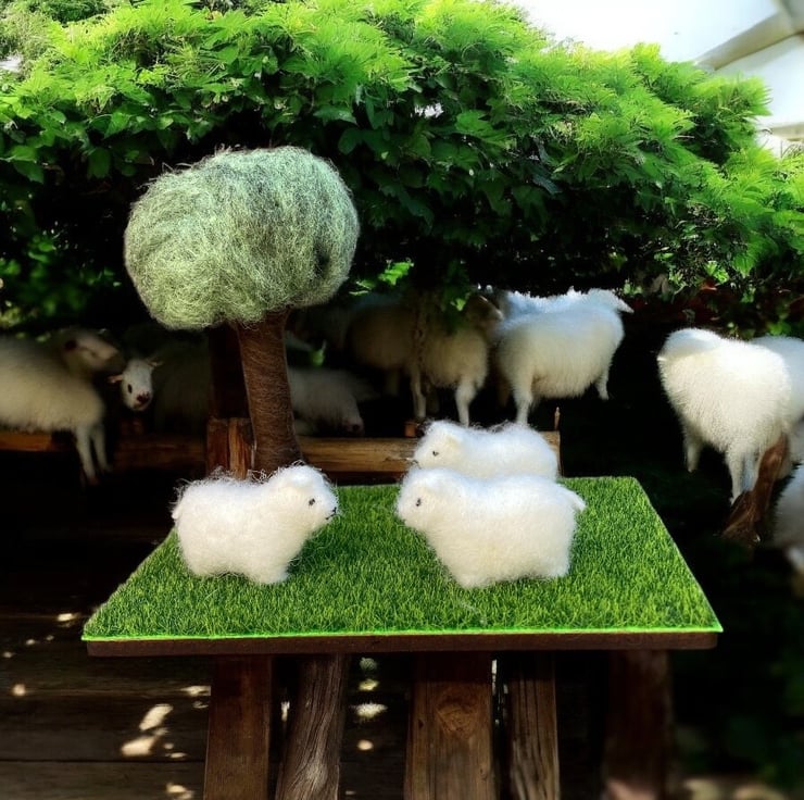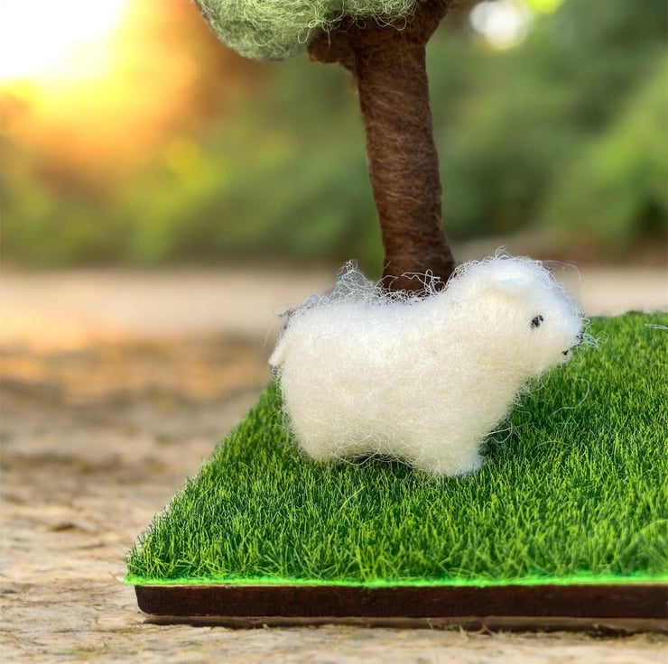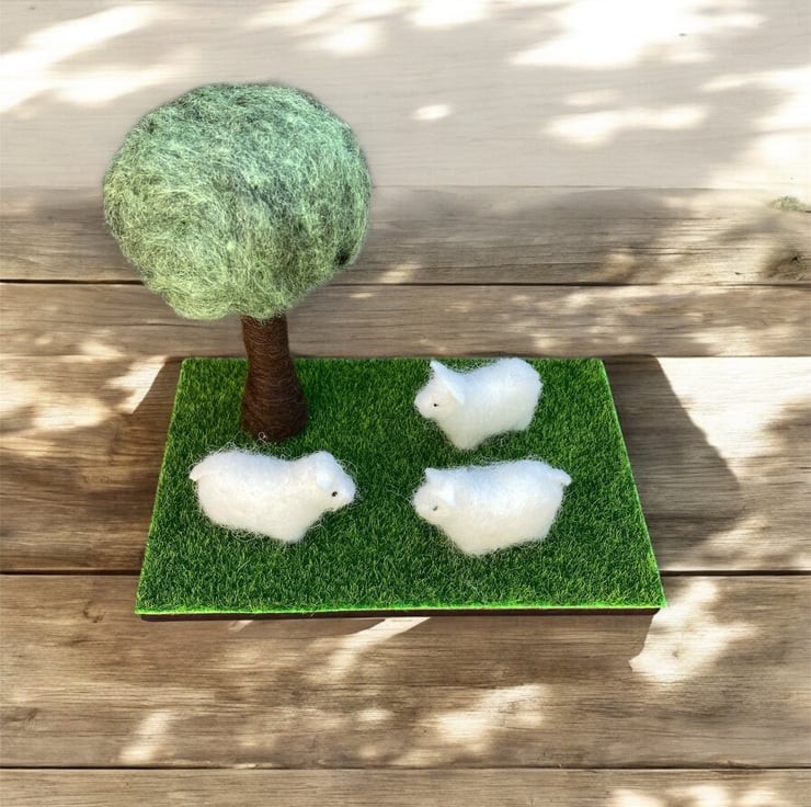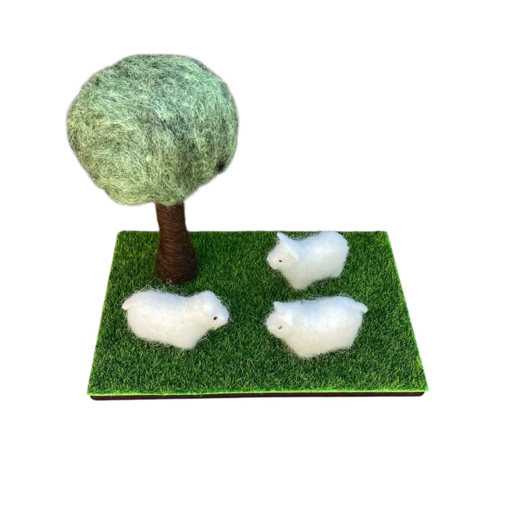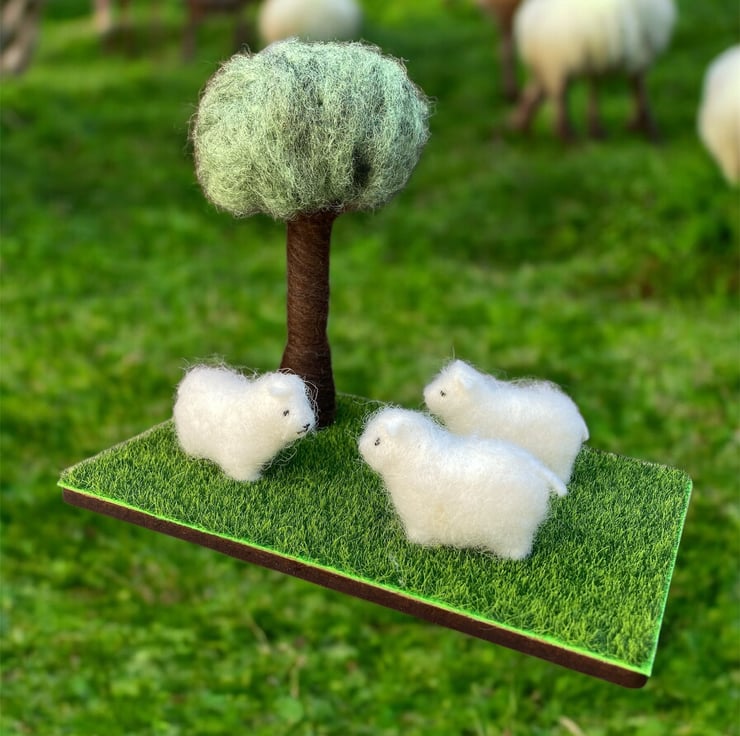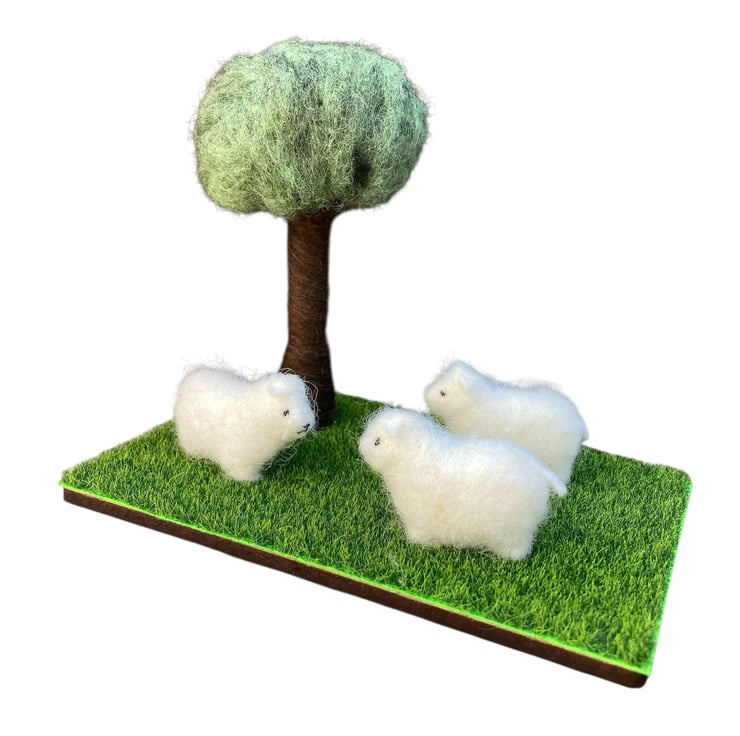 A country scene ornament with three woolly sheep standing beneath a tree. The sheep have been made from 100% wool felt, stuffed and covered in a white woolly coat. The tree has been needle felted using woollen fibres. The tree and sheep have then been mounted on a wooden base covered with artificial grass material.