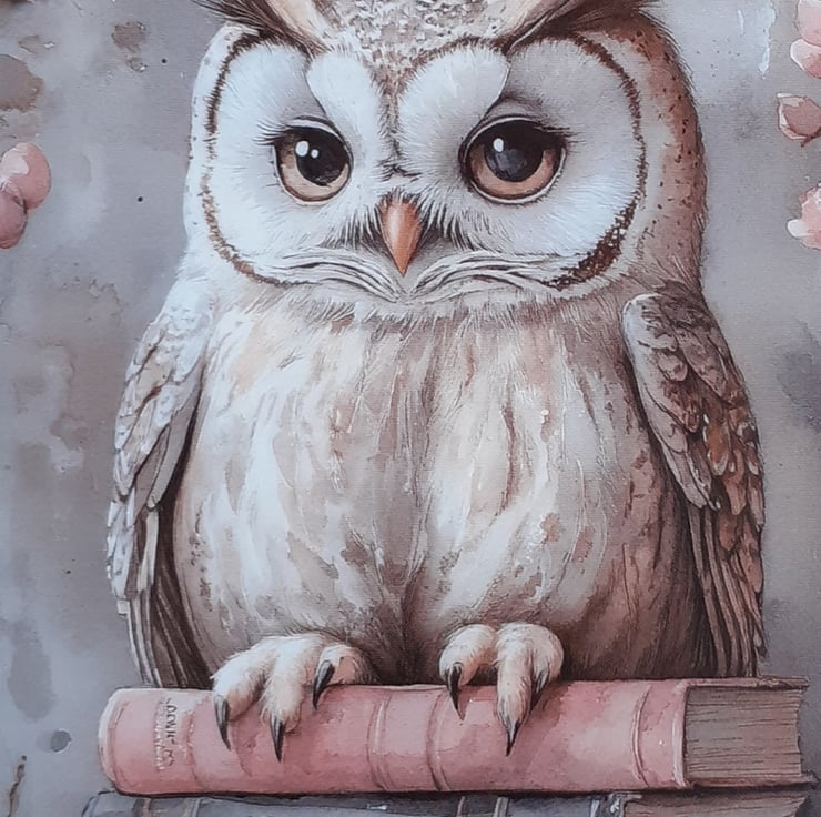 A dove grey owl sat on a pile of pastel coloured books with blossom in the background.