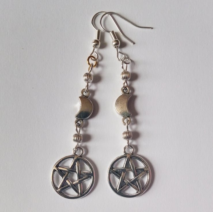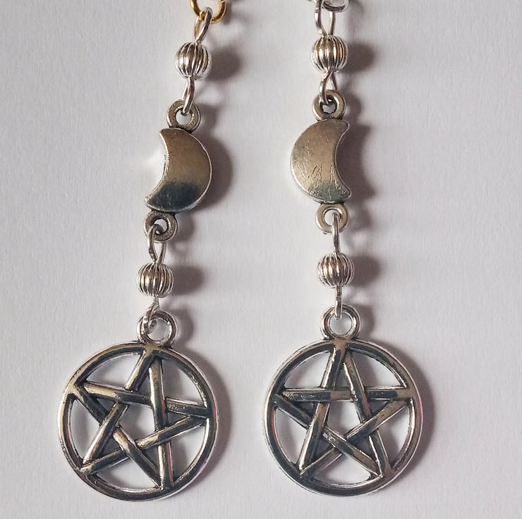 These beautiful earrings feature hanging pentacles with moons and beads on silver plated hooks.