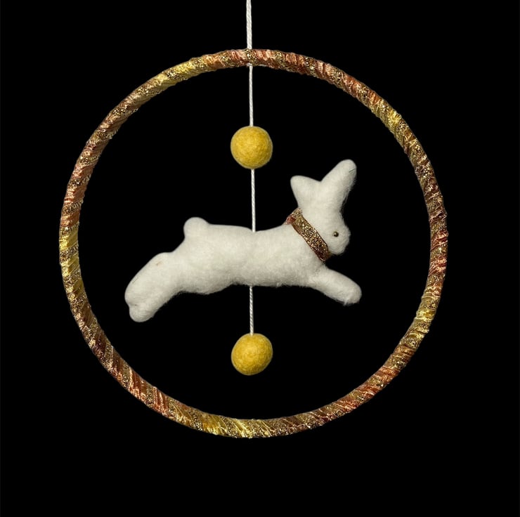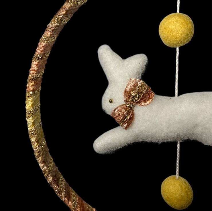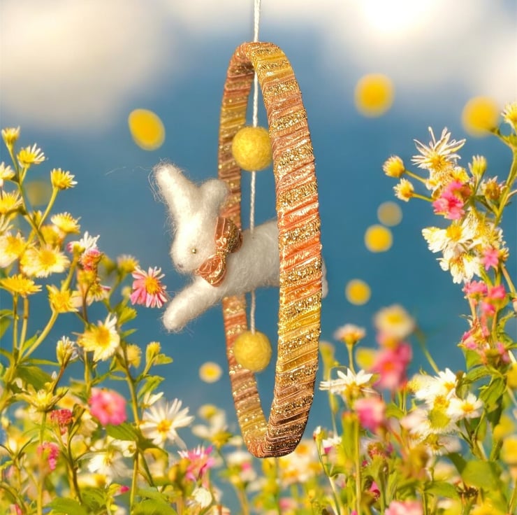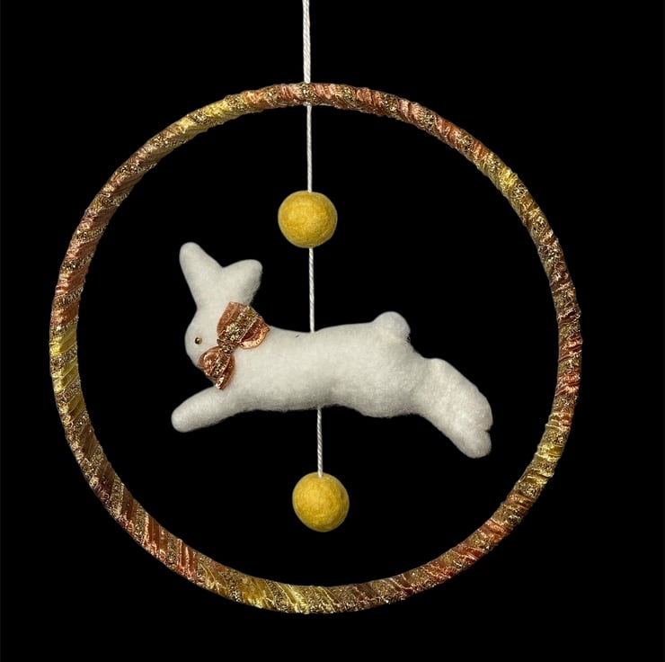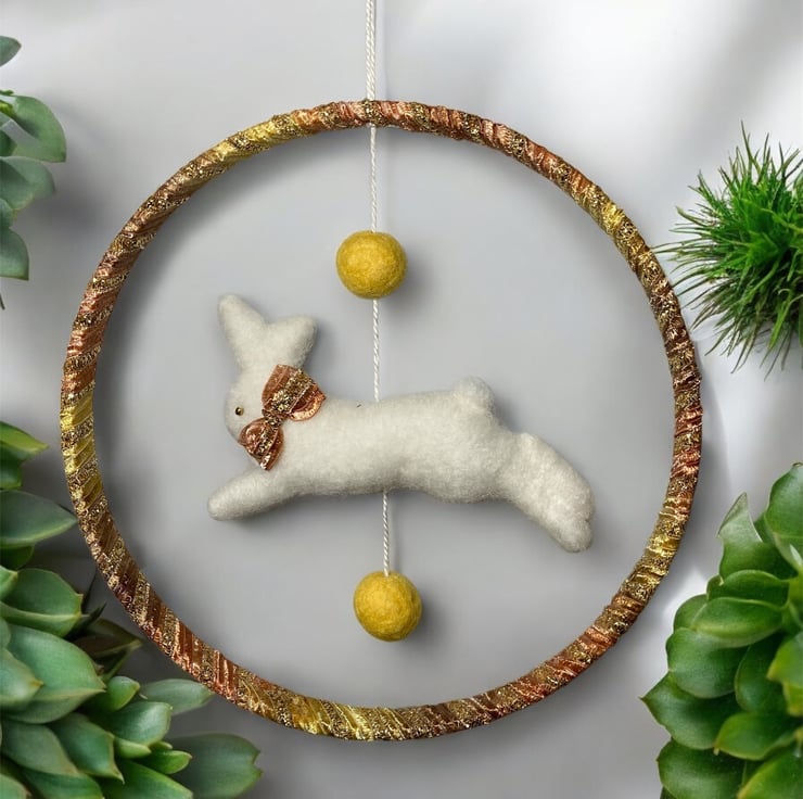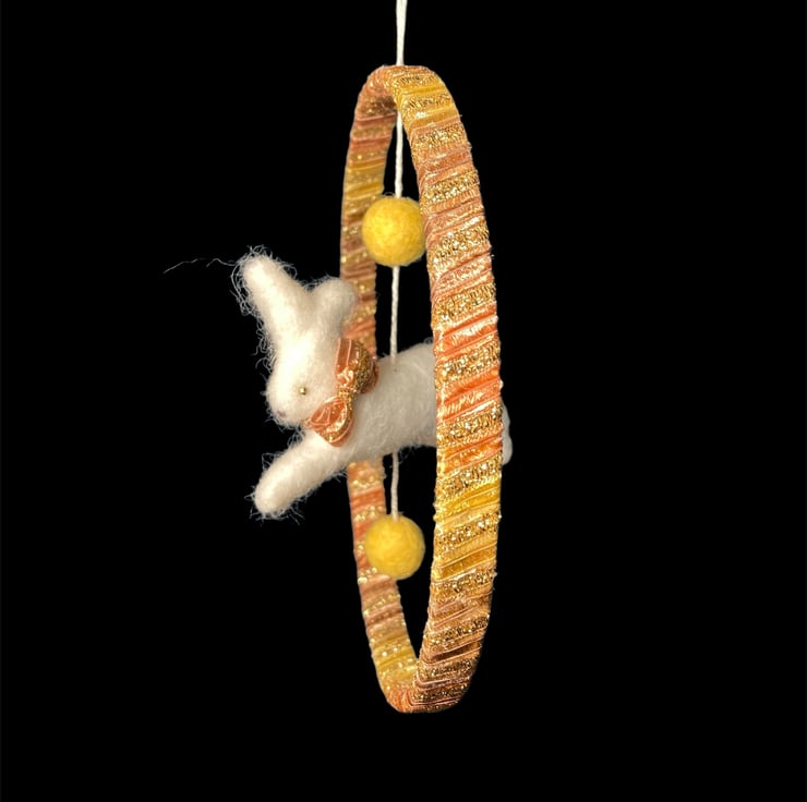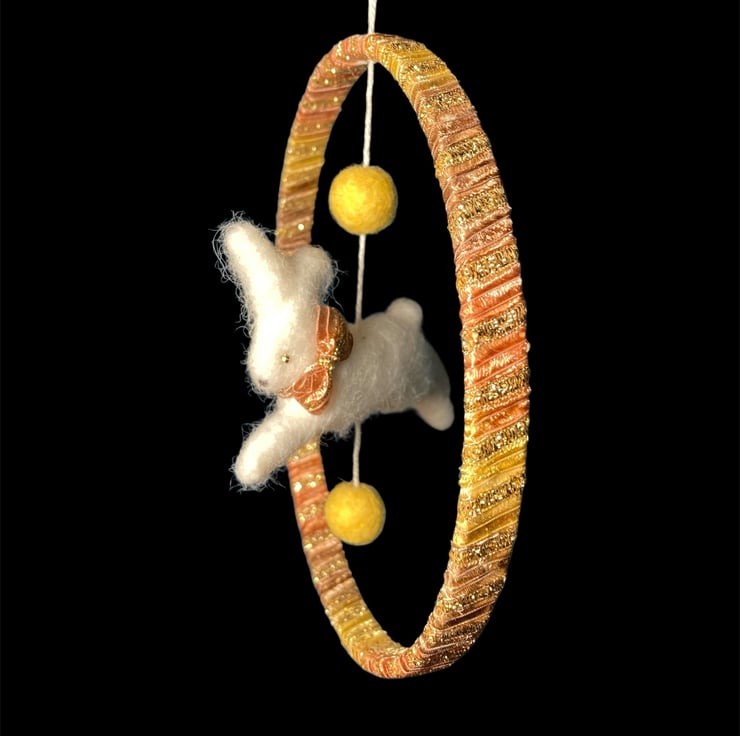 This pretty gold hoop hanging decoration features a felted running white rabbit hanging within a ribbon wrapped wooden hoop. The hoop has been wrapped in a sparkly golden ribbon and the bunny has a matching bow around his neck. Gold coloured beads have been used for the eyes and the bunny is suspended from the hoop, along with a couple of yellow felt balls , by means of a white cotton thread. A small hanging loop has been added.