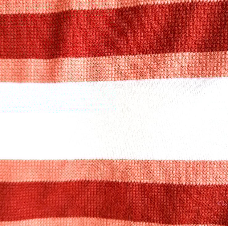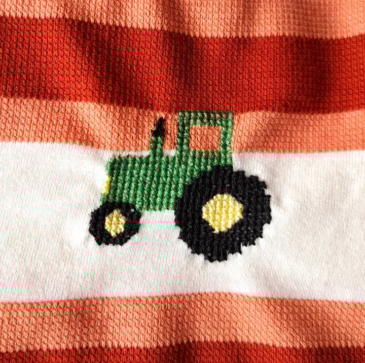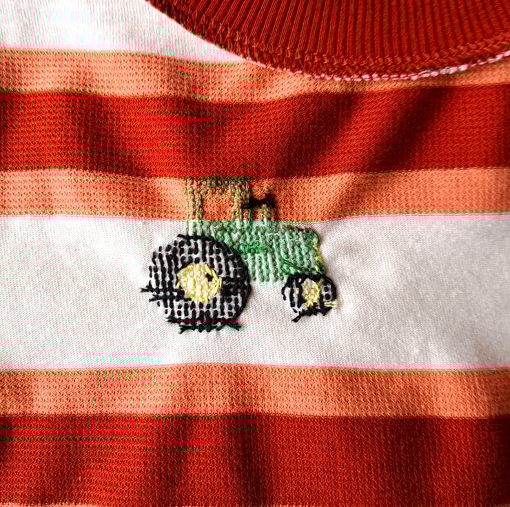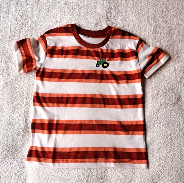 This is a particularly lovely cream, red-brown and orange striped T-shirt. I have cross stitched a green and yellow tractor on the left front. The brown and orange stripes are a lightly textured knit as shown in one of the photos. As I never use a permanent backing material when hand stitching kids' clothing, there is nothing inside to irritate your child's skin. The shirt has short sleeves and a round neck. It is cotton and machine washable.