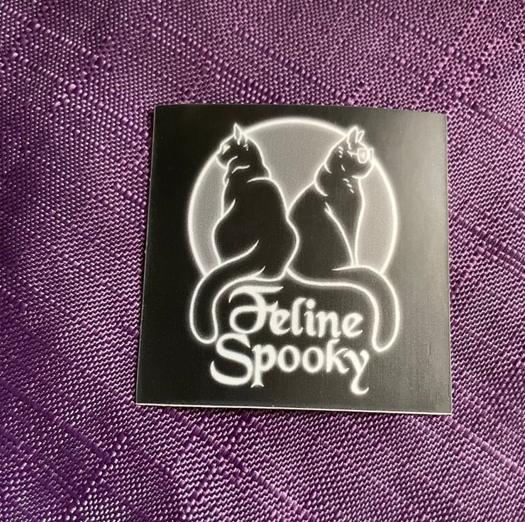 A spooky 5 x 5 cm non coated plastic square sticker. For Spooky felines fans. This is the official logo of the Feline Spooky Podcast https://felinespooky.buzzsprout.com