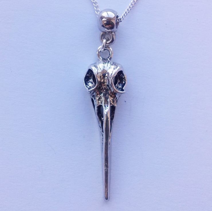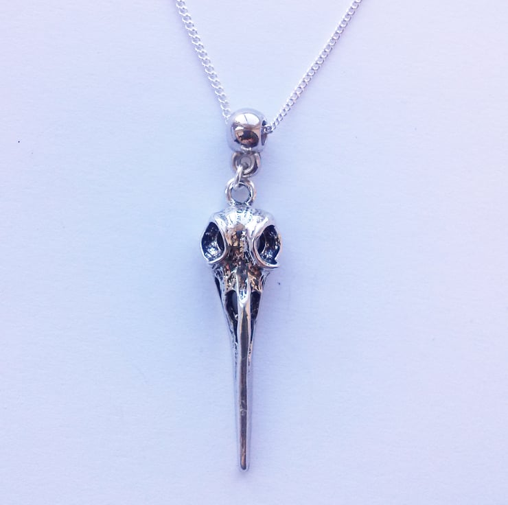 This stunning necklace features a nice bird skull pendant hanging on silver plate chain.