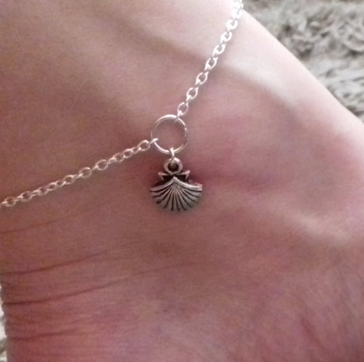This sweet anklet features a nice shell charm hanging on silver plate chain.