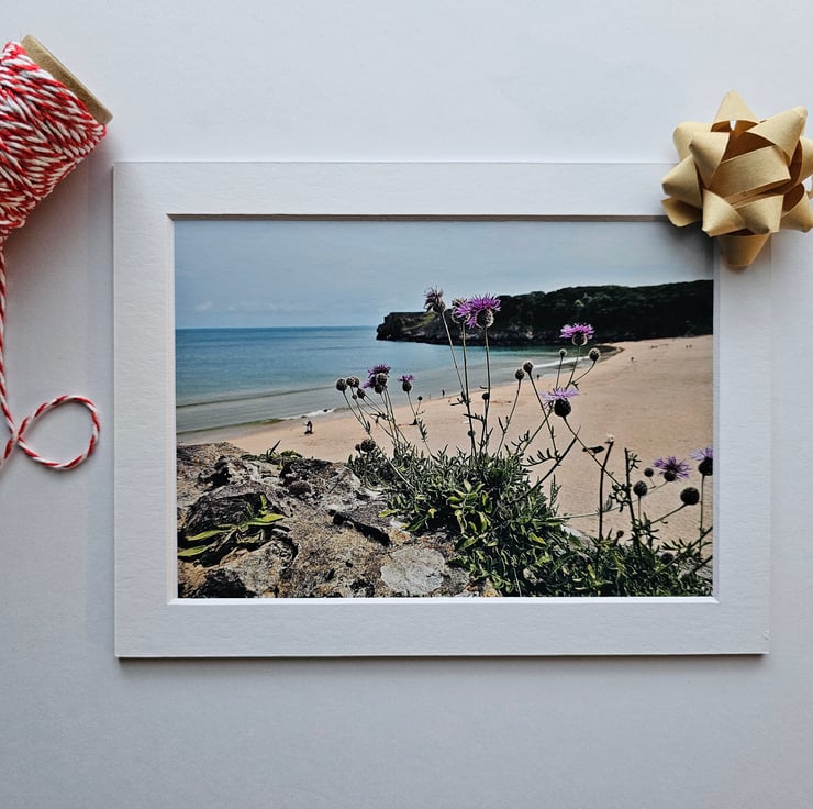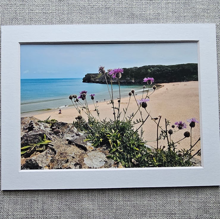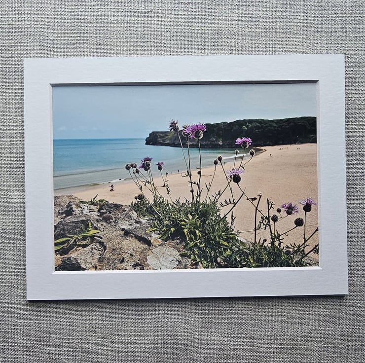 This item includes a professionally printed 7" x 5" photo of Barafundle beach with a 8" x 6" quality white mount (1,25mm thick) and a backing board. The photo is printed on matt photo paper. If you want to put the mounted photo in a frame, you will need a frame to fit a 8" x 6" picture.