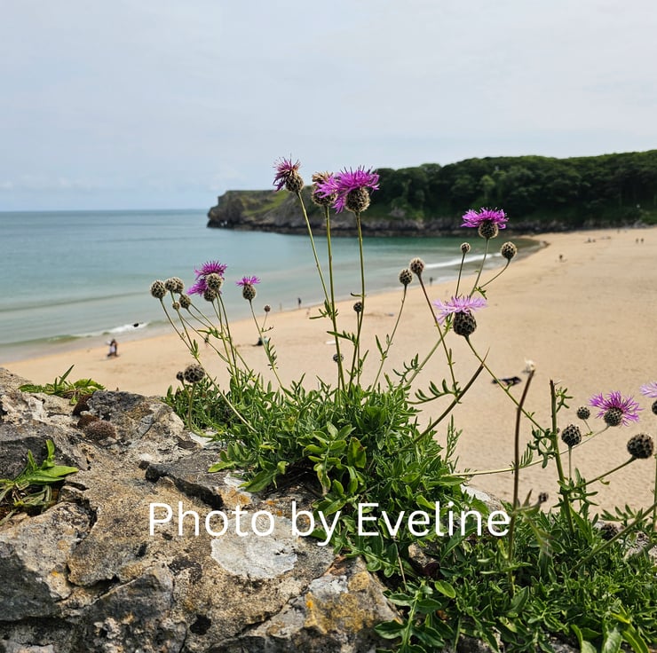The photo features this gem of a beach we discovered on our family holiday in June 2025 in South Pembrokeshire. Accessed on foot only along the Coast Path, it is both beautiful and quiet. The view from the top with the wildflowers growing on a wall was just stunning.