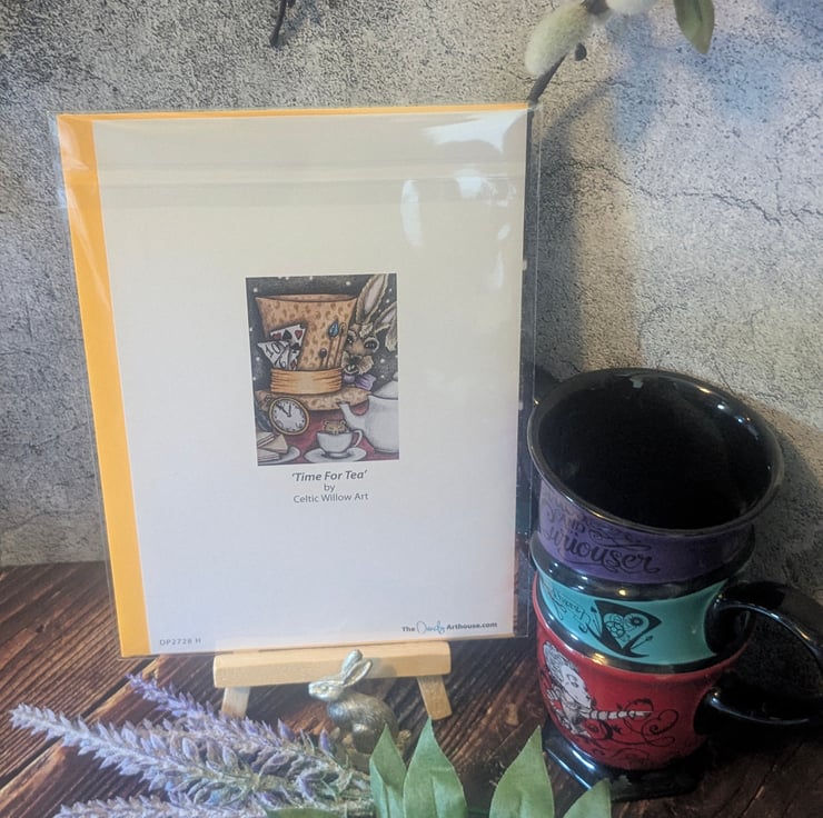 'Time for Tea ?' is a beautiful professionally printed greetings card from the original artwork of artist & illustrator Dawn Patricia Jones, Celtic Willow Art.
