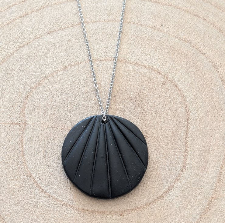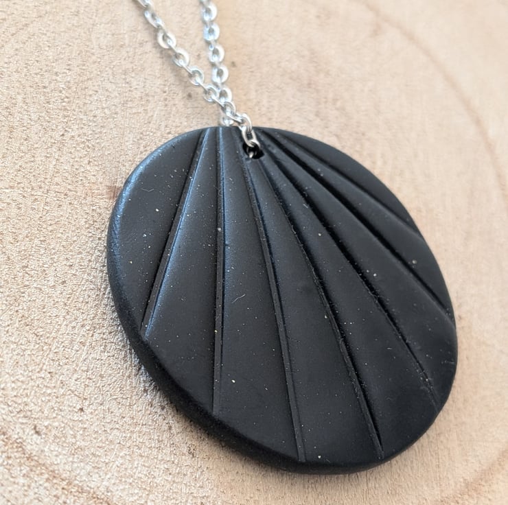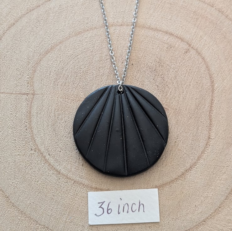 Unique black polymer clay necklace with a subtle sparkle, on a longer length (36 Inch) stainless steel chain. As well as jewellery, the longer length of this necklace lends itself to doubling up as a sensory, fidget accessory.