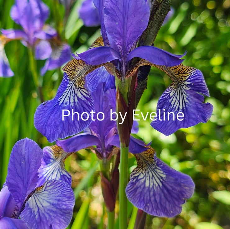 The photo features blue irises and was taken in May 2025 at Bodnant Gardens in North Wales, one of my favourite places to visit (especially in late Spring).