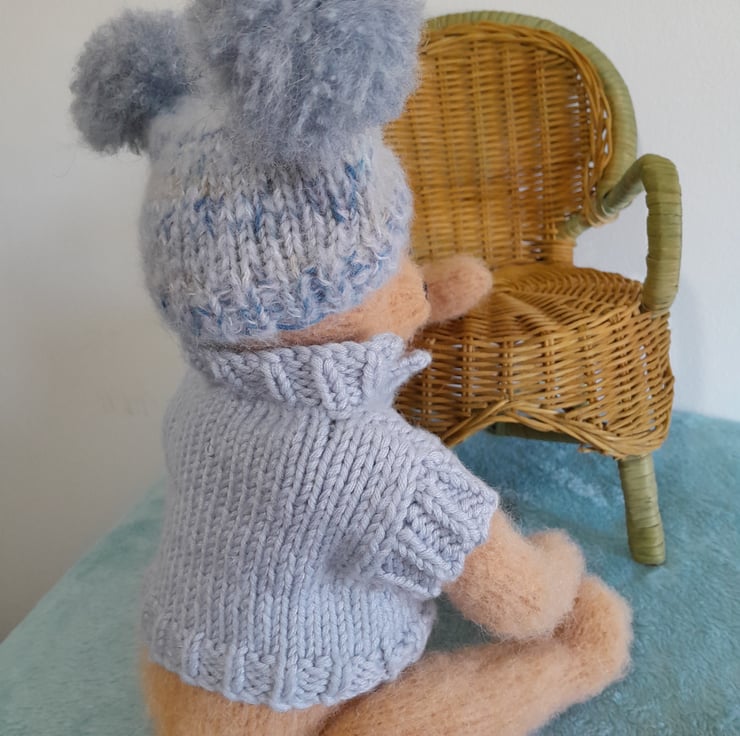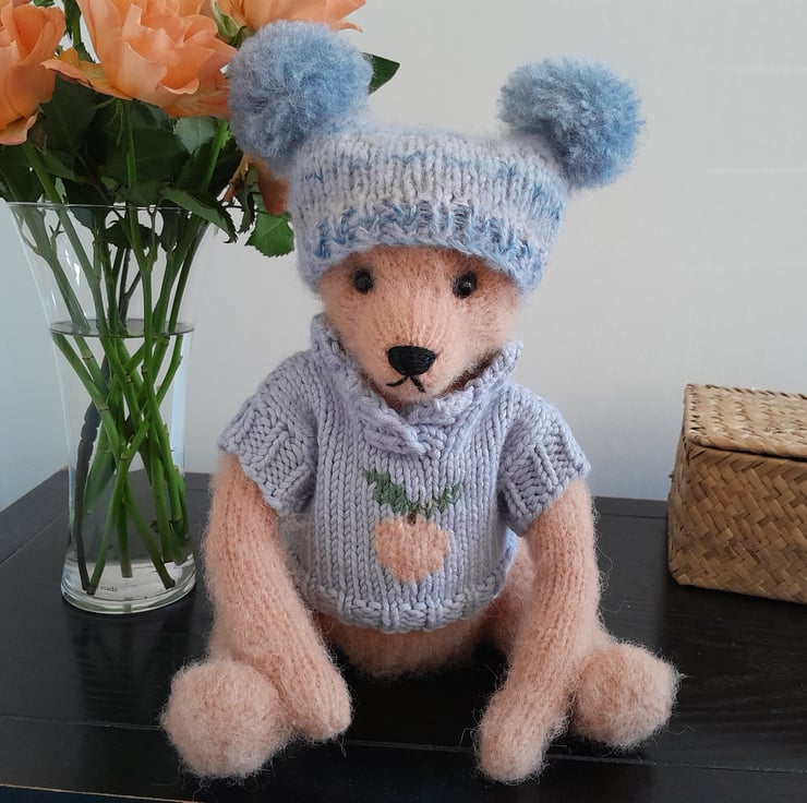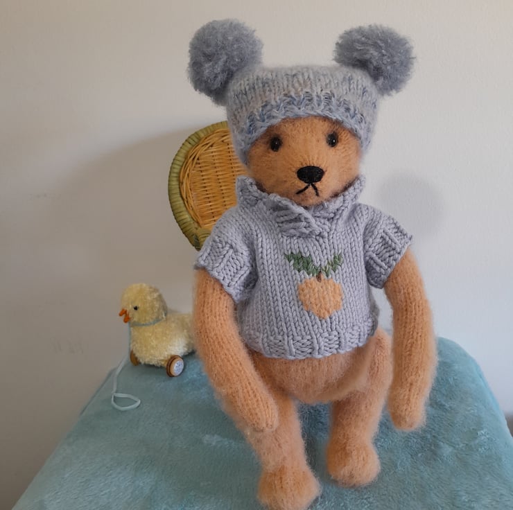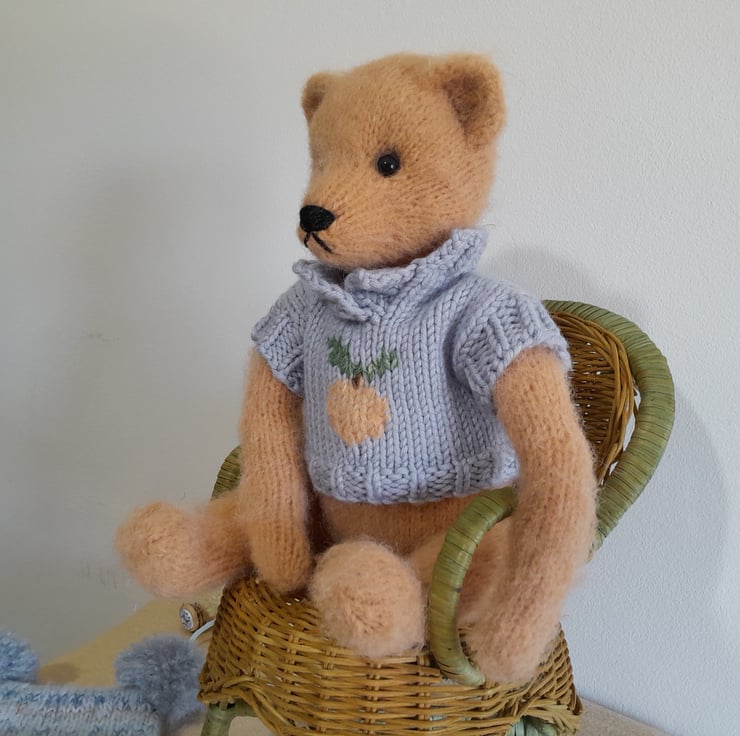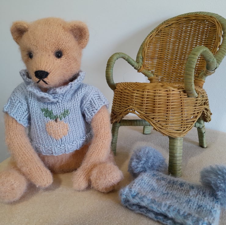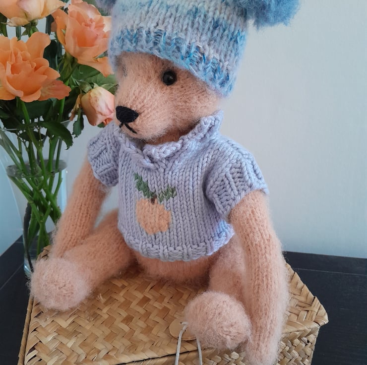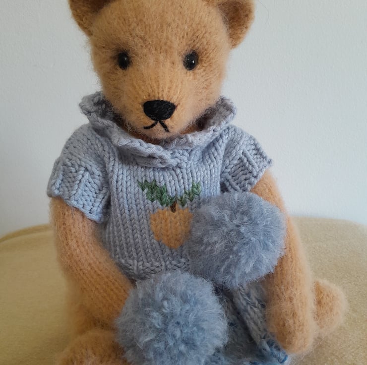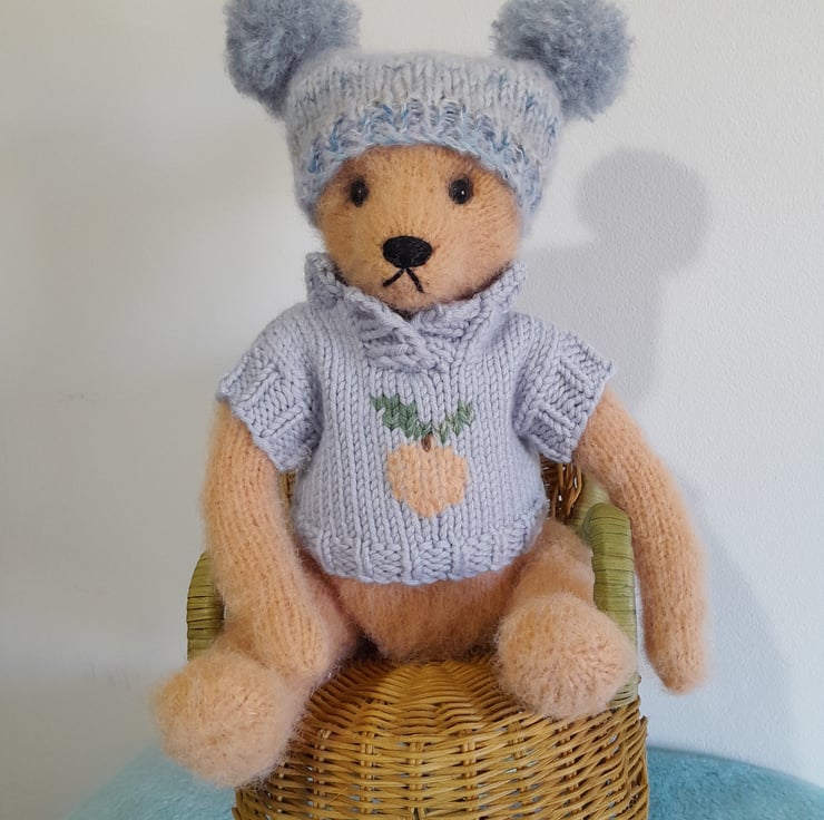 Her knitted sweater is in a beautiful shade of pale blue with an embroidered furry apricot and her matching hat has the fluffiest pompoms.