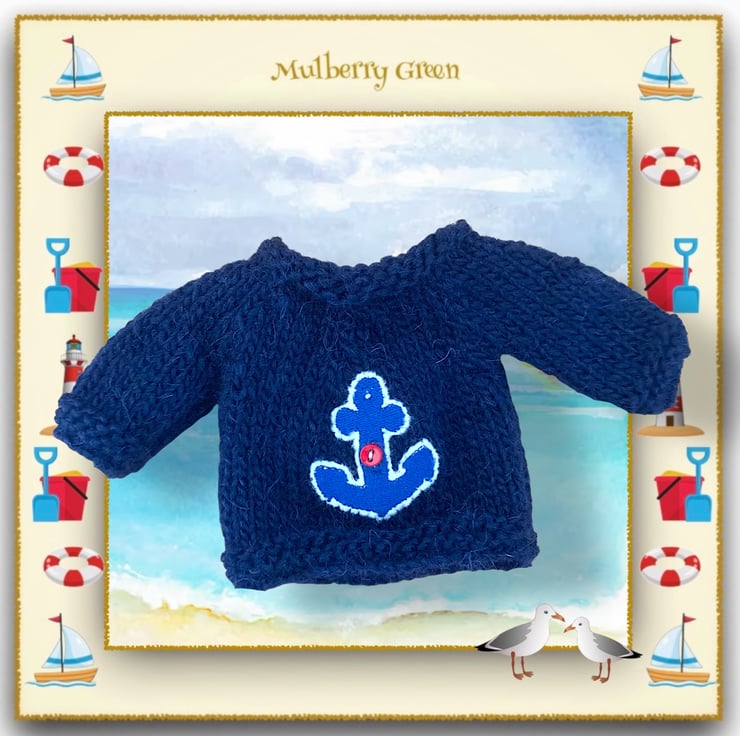 A lovely navy blue jumper in pure Icelandic wool, decorated with ann embroidered anchor, to fit the Mulberry Green characters. The jumper is hand knitted and fastens with a little popper at the back.