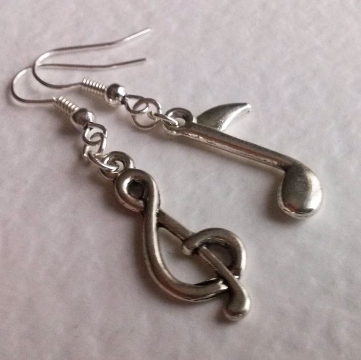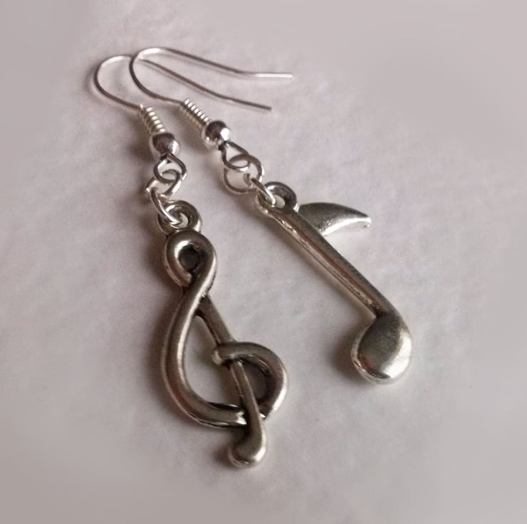 These beautiful earrings feature lovely mismatched music note charms hanging from silver plate hooks.
