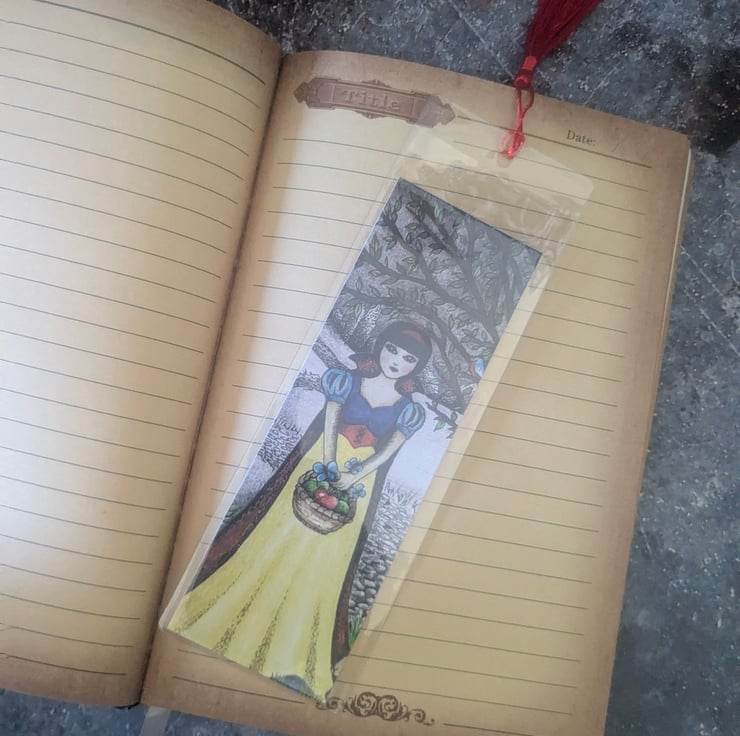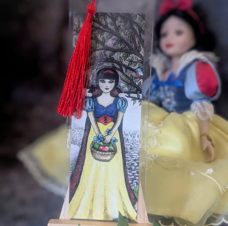 Based on the original artwork 'The Fairest' this is a beautiful bookmark, professionally printed on card, in a protective transparent sleeve & finished with a coloured tassel that compliments the artwork.