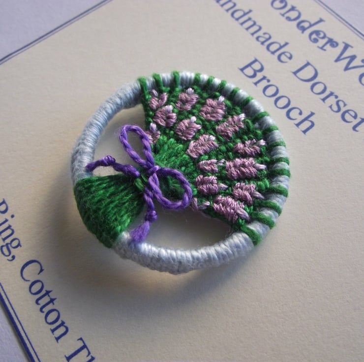 I made this lavender bouquet brooch using traditional Dorset button techniques, of working cotton thread on a brass ring, forming a bouquet of lavender tied with a purple bow.