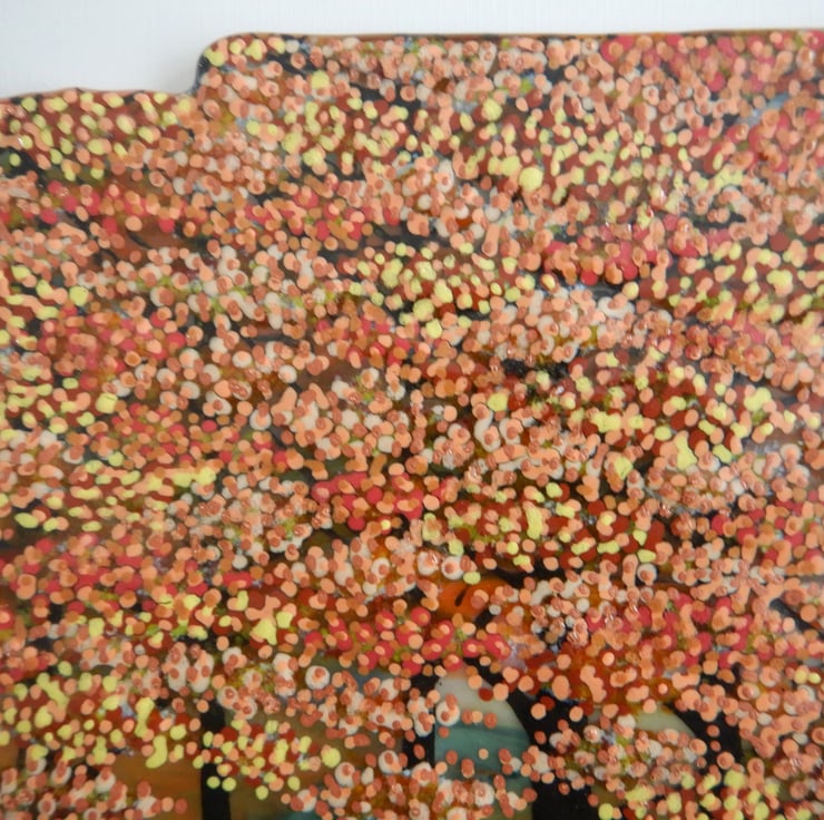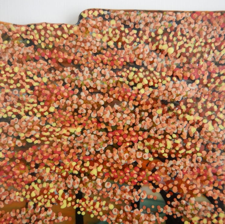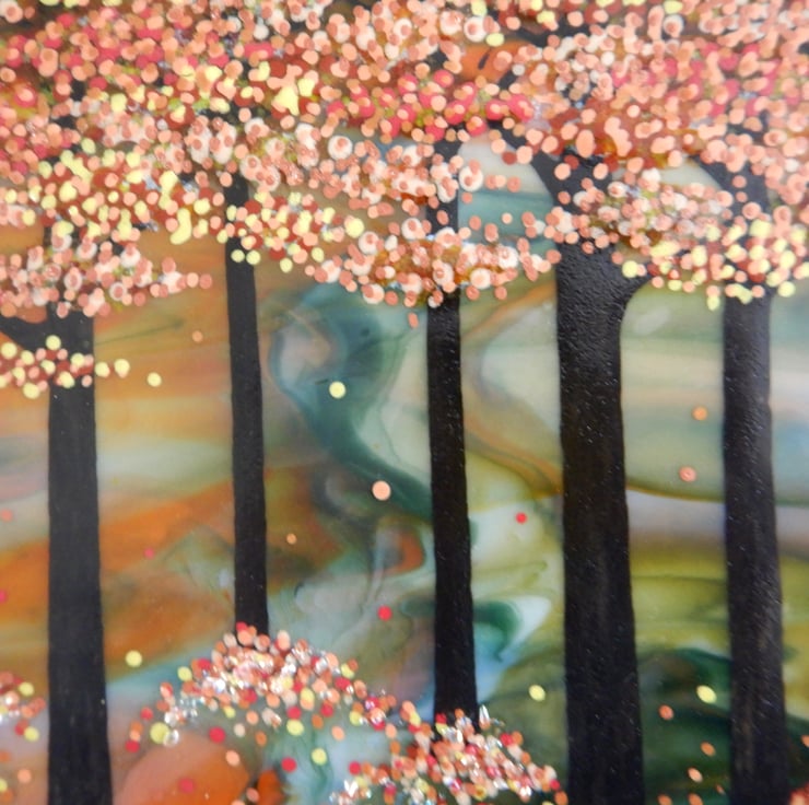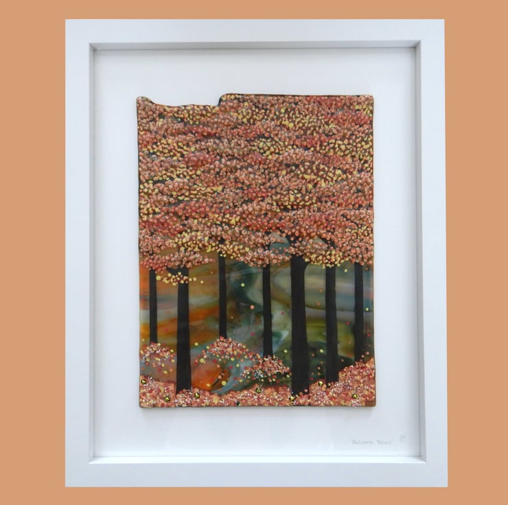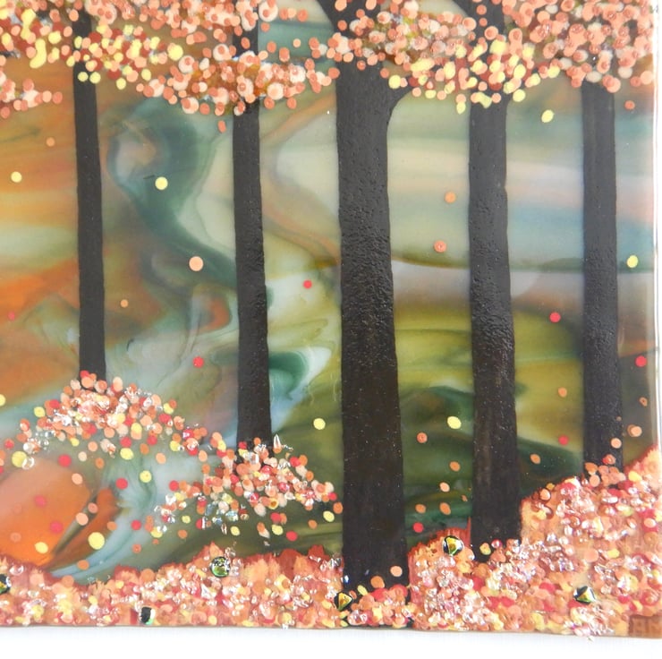 'Autumn Trees' glass painting has been created by carefully hand-painting the black tree silhouette onto the surface of the wispy autumn Bullseye glass. The paint used is very finely ground coloured glass that is mixed with water to create a liquid paint. I added a few touches of dichroic glass in the foreground just to give it a little twinkle. Once the glass paint is dry and the image carefully tidied up, the glass picture is fused in a kiln. The firing of the picture takes up to 14 hours as the kiln must be cooled very gradually to avoid breaking the fusing glass.
